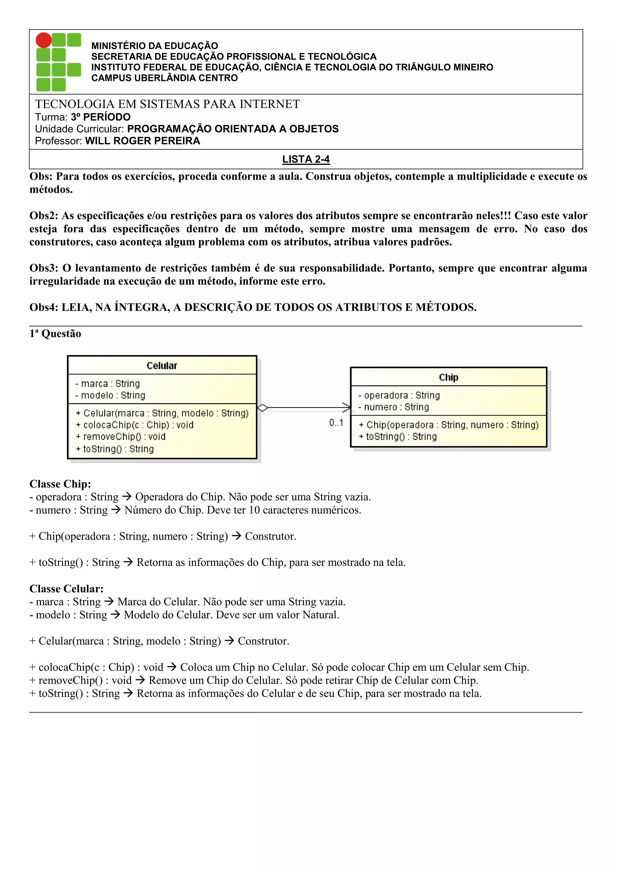 Este documento apresenta 5 questões sobre programação orientada a objetos em Java. Cada questão descreve classes com atributos e métodos e pede para que sejam criados objetos respeitando as especificações dadas.