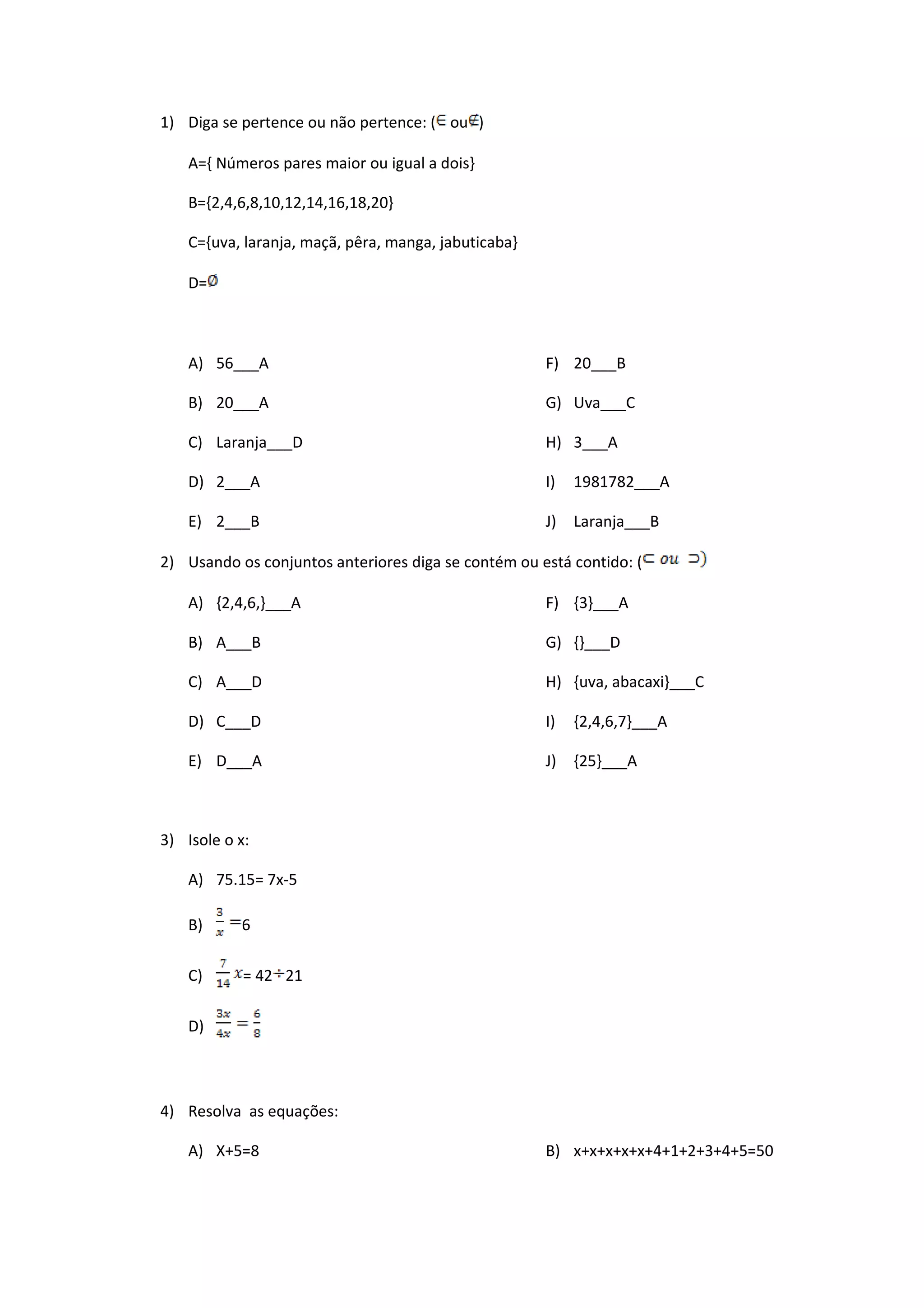 1) Pertence ou não pertence a conjuntos. Respostas: 56 não pertence a A; 20 pertence a A e B; Laranja não pertence a D. 2) Contém ou está contido em conjuntos. Respostas: {2,4,6} está contido em A; A contém B; C não contém D. 3) Isolamento de variáveis. Respostas: x = 75,15; x = 6. 4) Resolução de equações. Respostas: x = 3; x = 5; x = 1; x = -1.