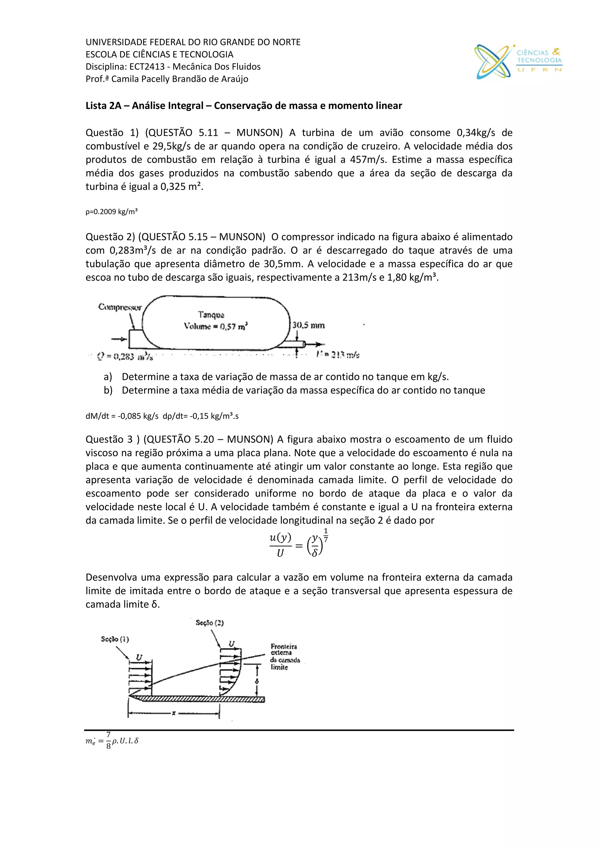 O documento apresenta 8 questões sobre mecânica dos fluidos, incluindo cálculos de vazão, massa específica, força de jatos de água e força para manter um tampão fixo. As questões envolvem conceitos como conservação de massa, momento linear e perfil de velocidade em camadas limite.