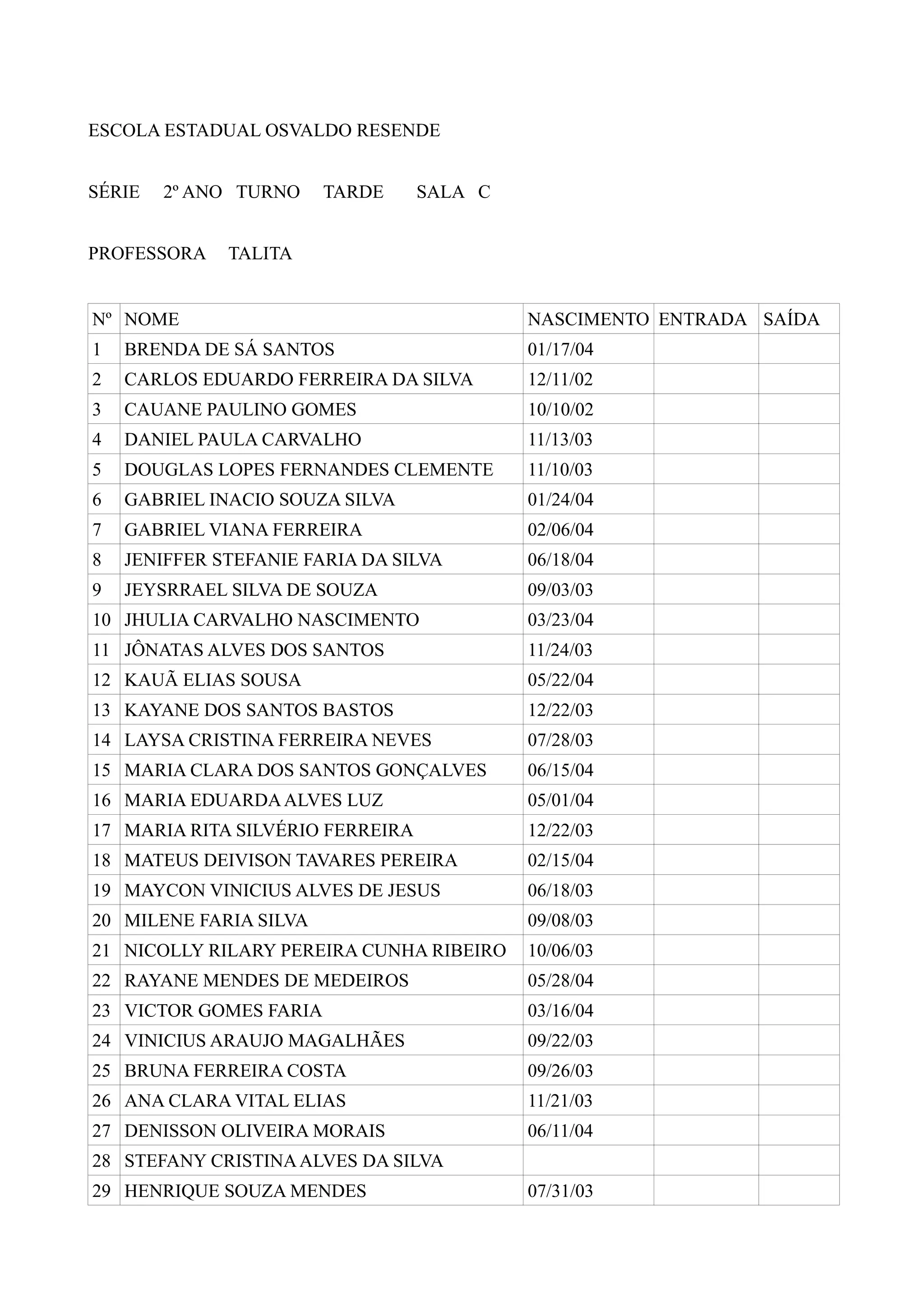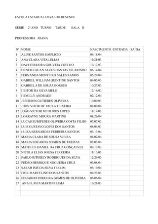 O documento lista os alunos matriculados em quatro turmas do 2o ano da Escola Estadual Osvaldo Resende, incluindo seus nomes, datas de nascimento e entrada/saída da escola. As turmas são divididas pelos turnos tarde e manhã e pelas salas C, D, 2 e 3.
