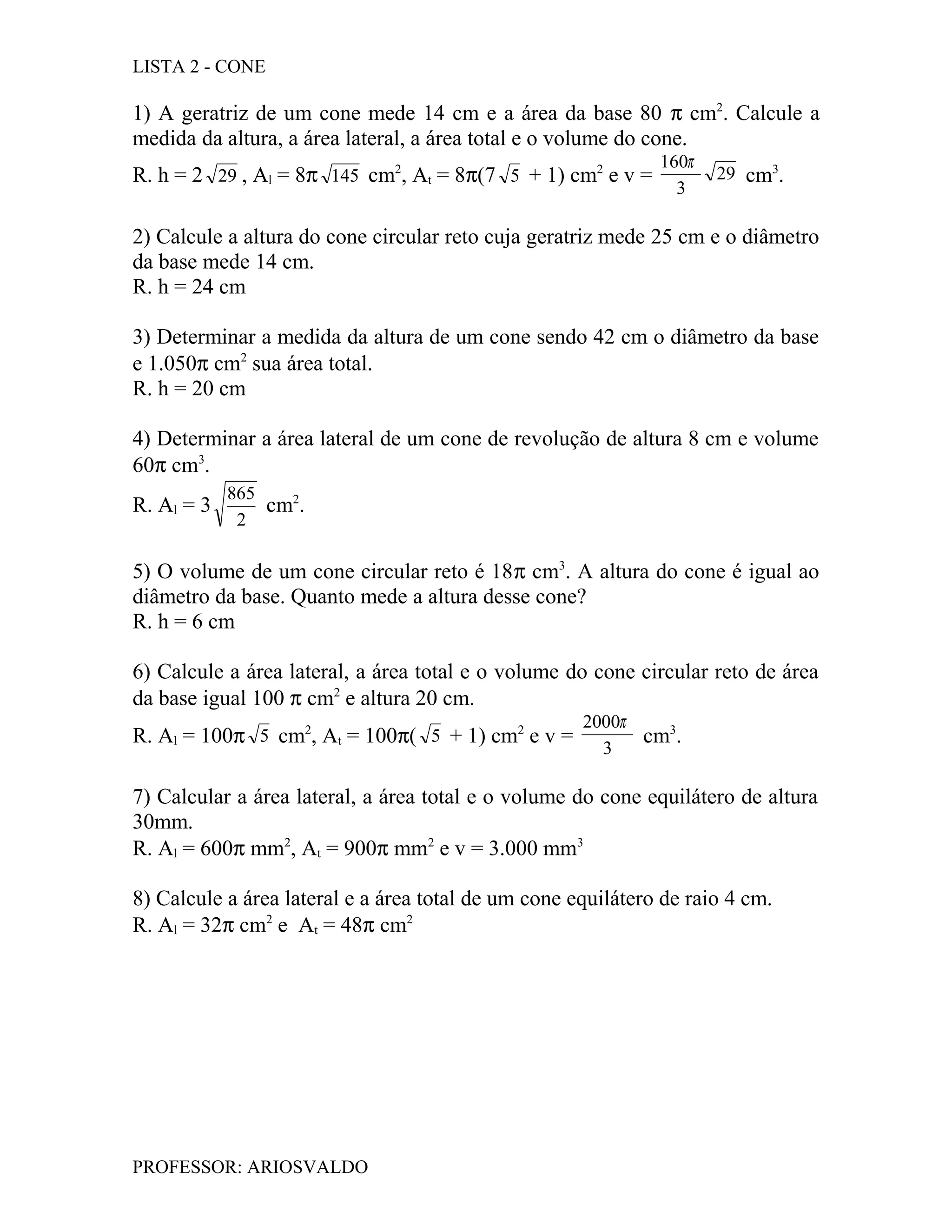 Este documento contém 8 problemas que envolvem cálculos de medidas geométricas de cones como altura, área lateral, área total e volume. Os problemas fornecem informações como geratriz, diâmetro da base, área da base ou volume para calcular as demais medidas desejadas.