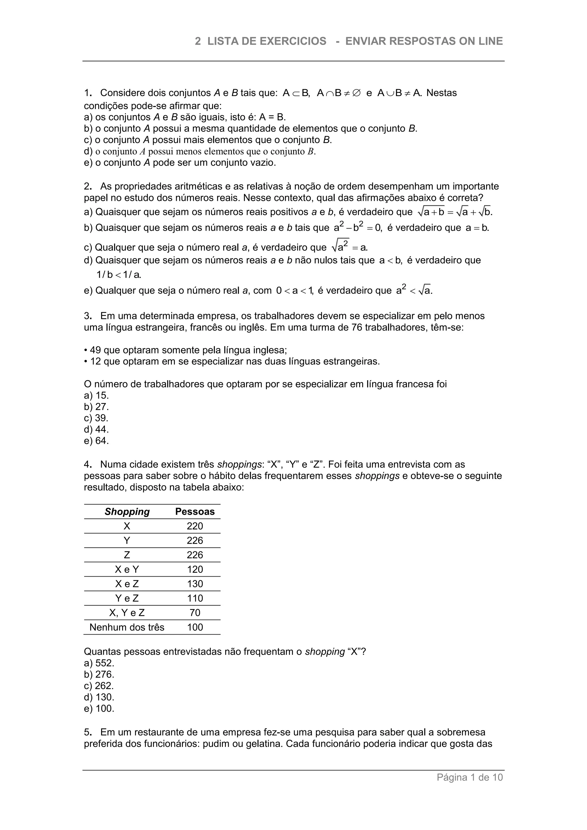 1) O documento apresenta uma lista de exercícios sobre conjuntos, números reais, probabilidade e estatística.