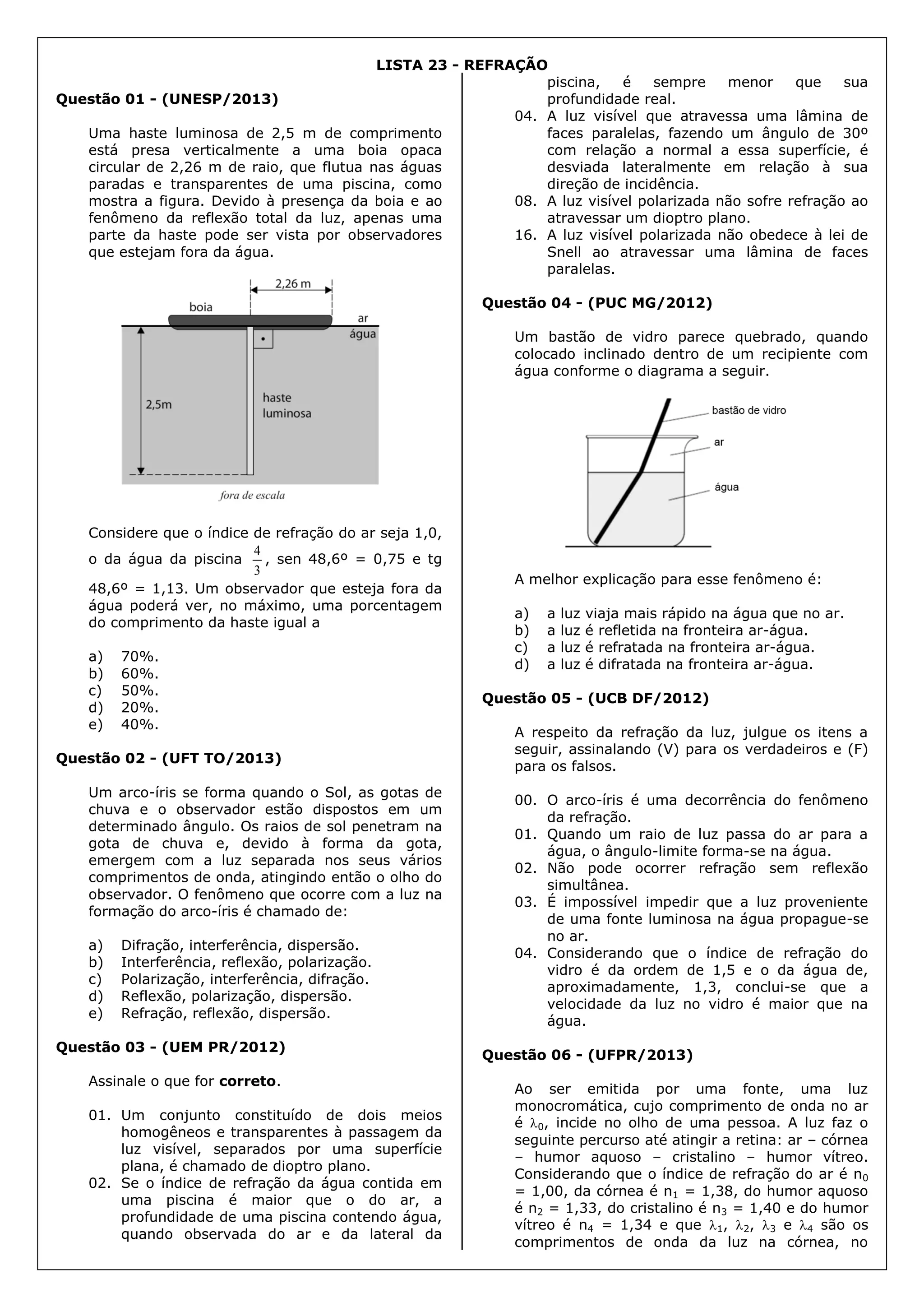 1) O documento apresenta 14 questões sobre refração da luz, envolvendo conceitos como reflexão total, formação de arco-íris, propagação da luz no olho humano e fibras óticas.