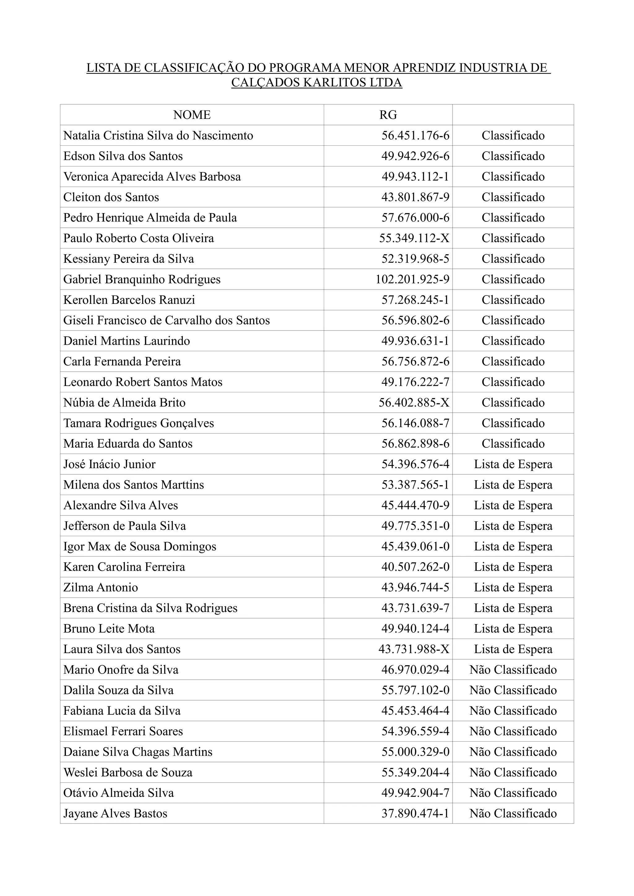 O documento apresenta a lista de classificação do programa Menor Aprendiz da indústria de calçados Karlitos Ltda, com candidatos classificados, em lista de espera e não classificados. A relação contém nomes, RGs e a situação de cada candidato. Em casos de desistência, os candidatos da lista de espera serão convocados por ordem de classificação.