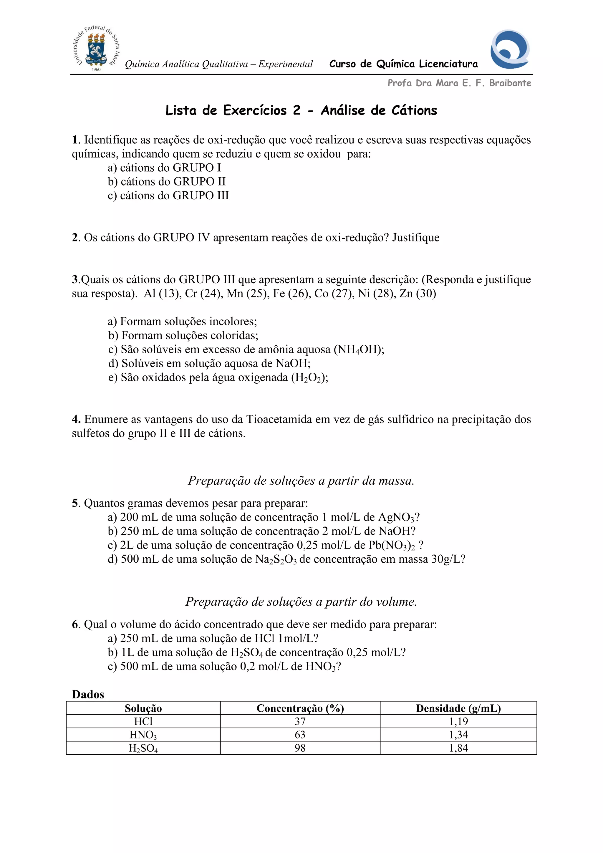 Este documento apresenta uma lista de exercícios sobre análise qualitativa de cátions. Os exercícios incluem identificar reações de oxirredução de diferentes grupos de cátions, características de cátions do Grupo III, vantagens do uso de tioacetamida em relação ao gás sulfídrico, cálculos para preparar soluções a partir de massa e volume, e dados sobre densidades de ácidos.