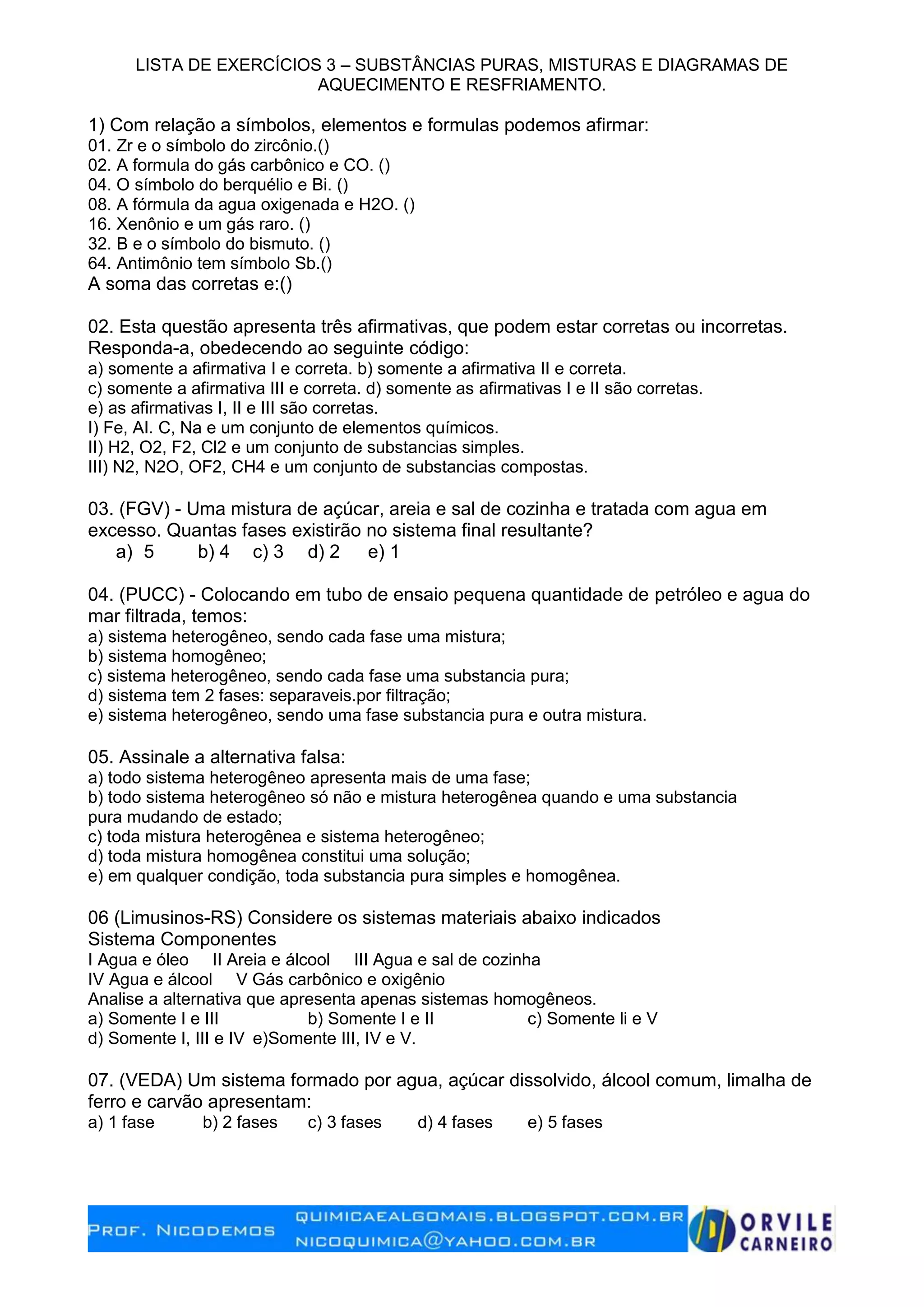 1. O documento apresenta uma lista de exercícios sobre substâncias puras, misturas e diagramas de aquecimento e resfriamento.
