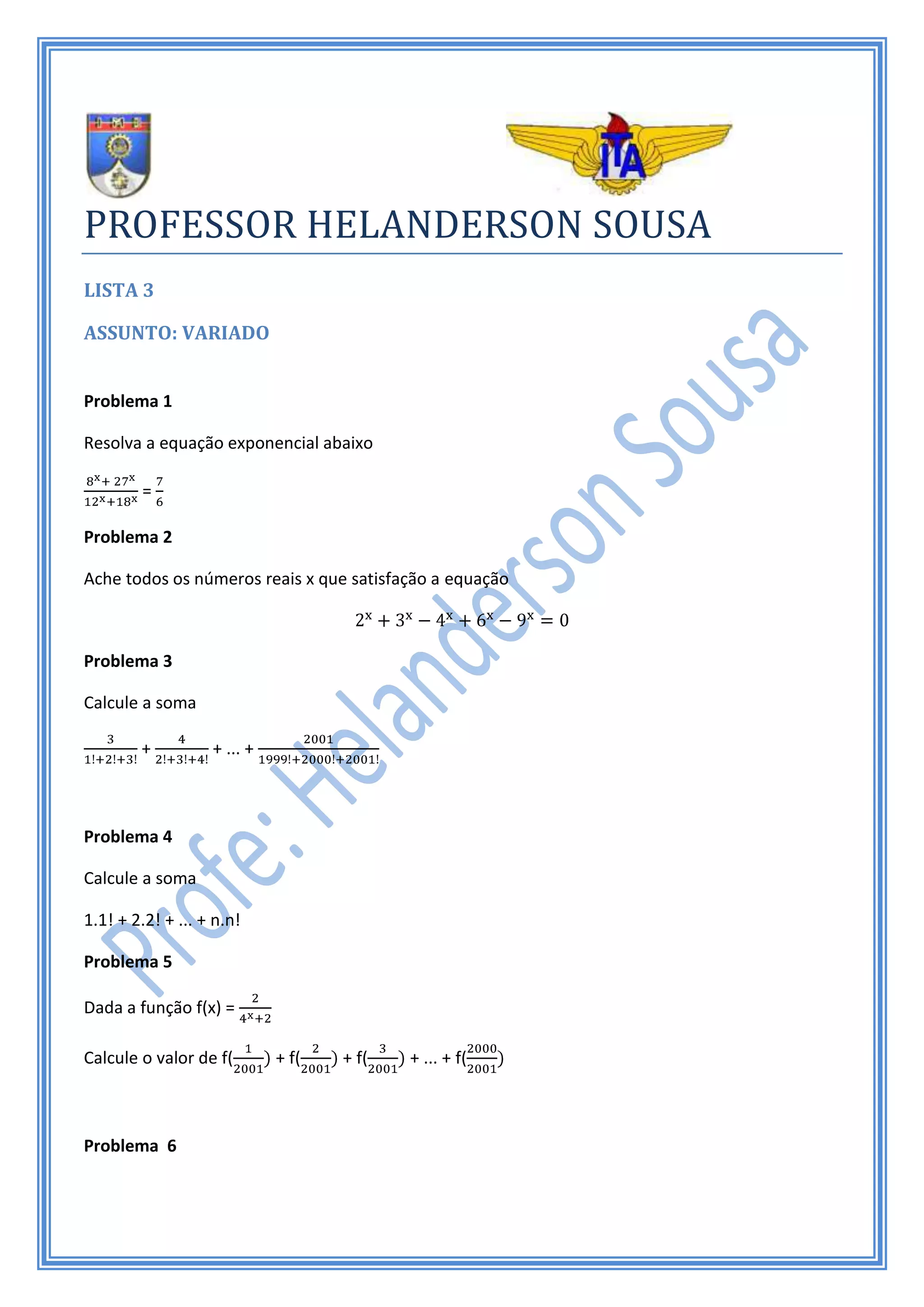 1) As soluções da equação exponencial são x = -1 e x = 1. 2) A única solução da equação polinomial é x = 0. 3) A soma dos fatores é 12 - 12001!.