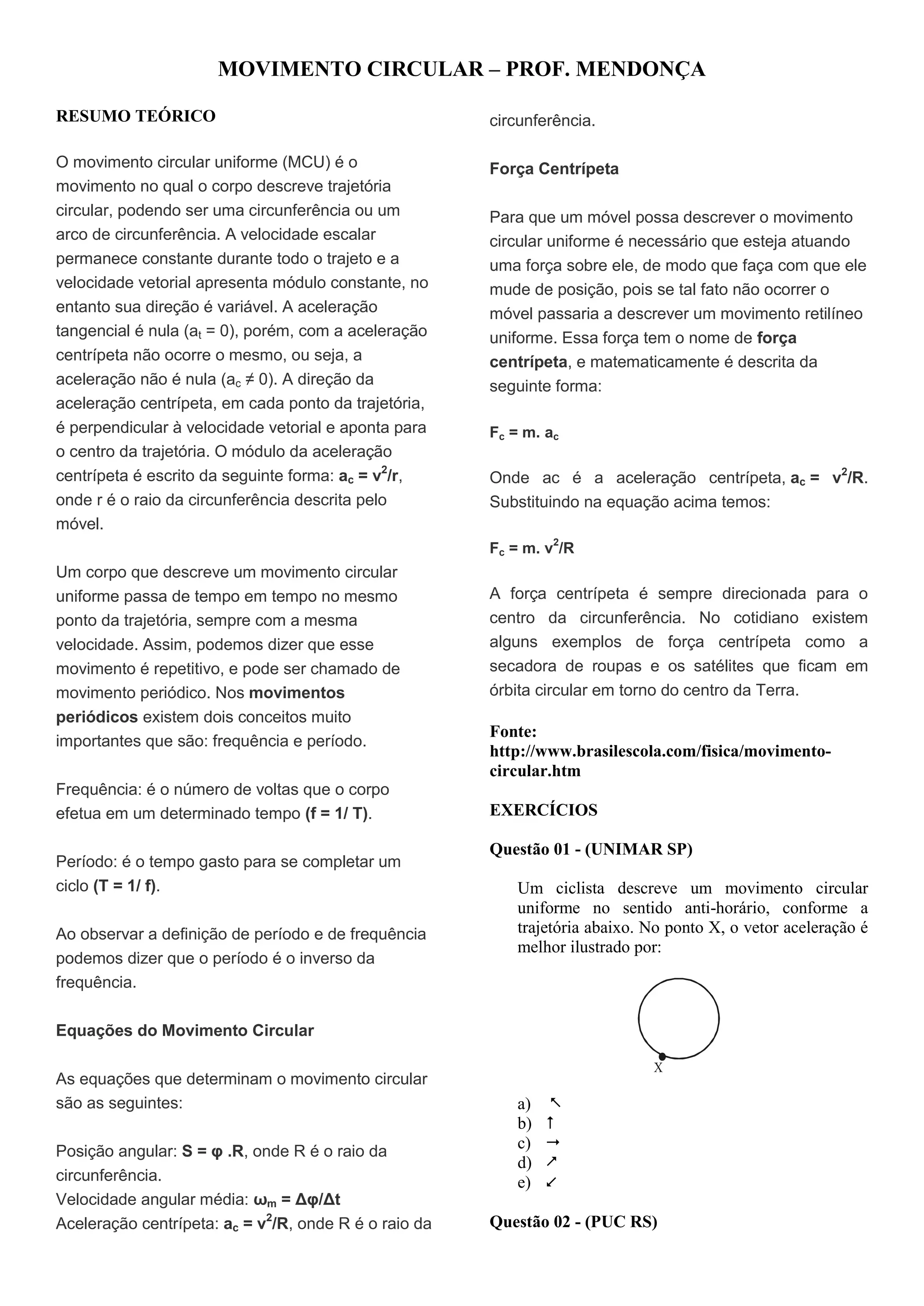 O documento descreve o movimento circular uniforme, definindo-o como um movimento no qual o corpo descreve uma trajetória circular com velocidade escalar constante. A velocidade vetorial tem módulo constante, mas direção variável, enquanto a aceleração centrípeta aponta para o centro da trajetória. O documento também apresenta equações para posição angular, velocidade angular média e aceleração centrípeta no movimento circular.