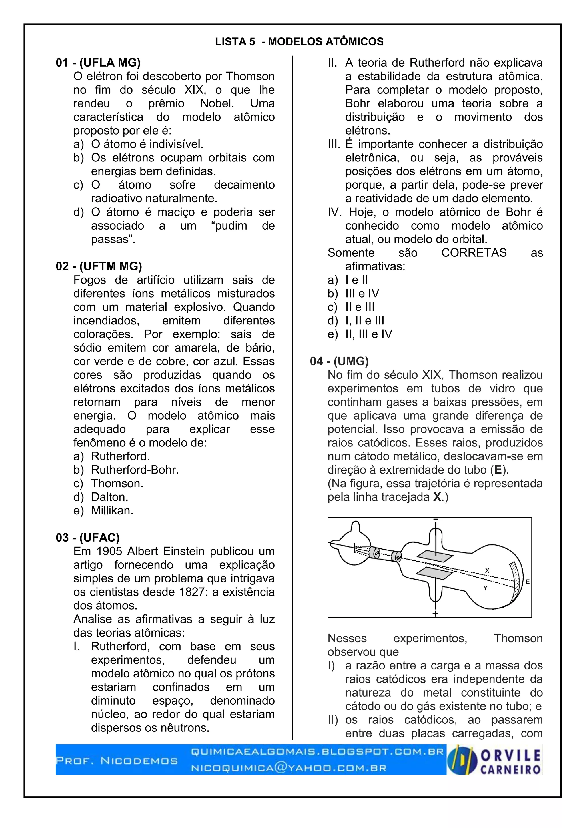 2) Inclui perguntas sobre o modelo atômico de Thomson, Rutherford, Bohr e experimentos de Crookes e Rutherford.