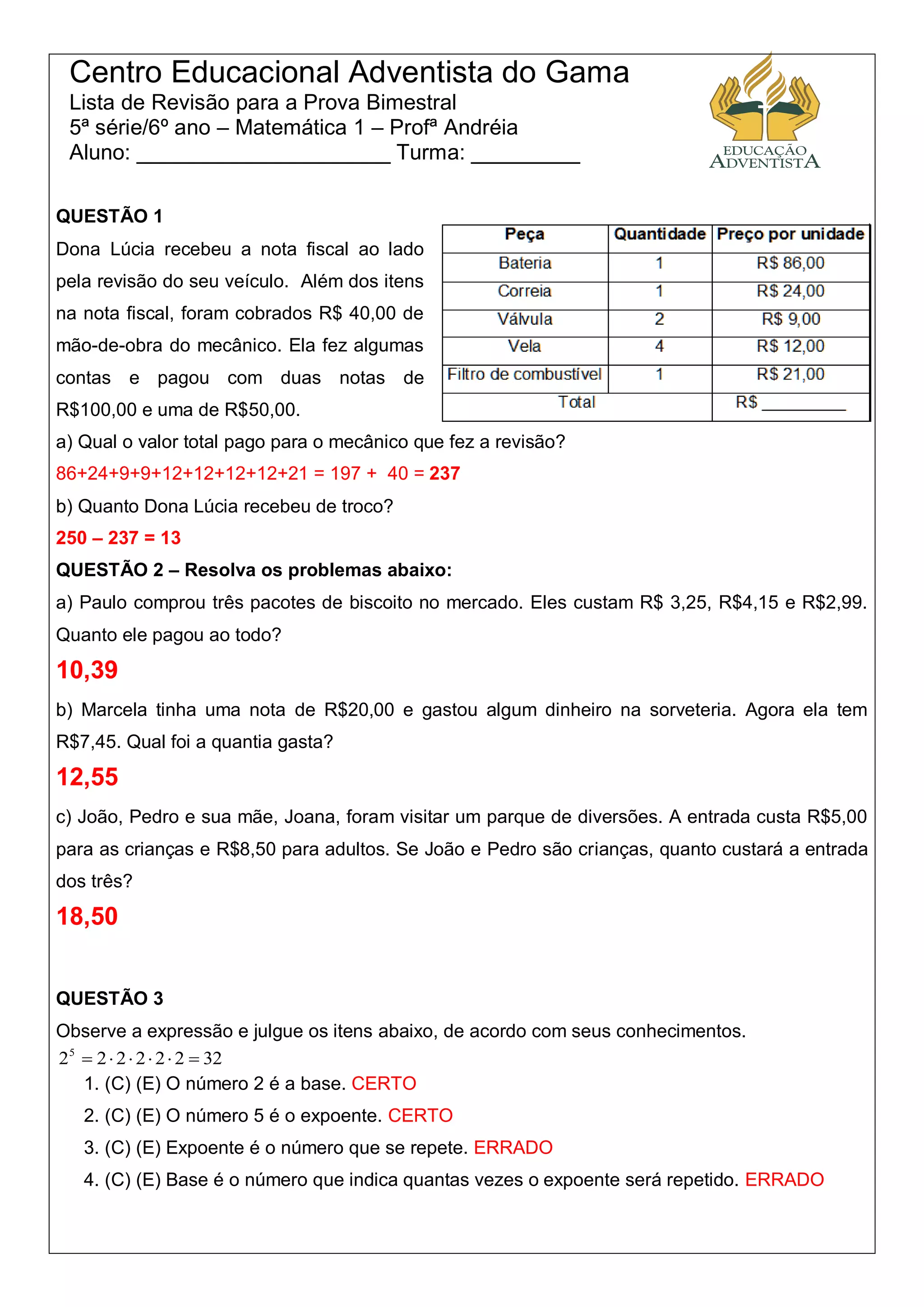 2) A primeira questão envolve cálculos com notas fiscais e troco. A segunda pede para calcular valores totais pagos em compras e quantias gastas. A terceira avalia entendimento de exponenciação.