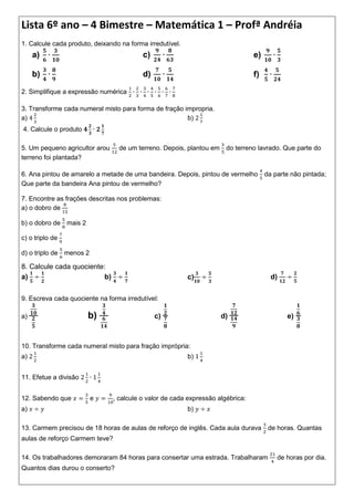 1) Lista de exercícios de matemática do 6o ano com produtos, simplificações, conversões entre frações e numerais mistos, divisões e expressões algébricas.