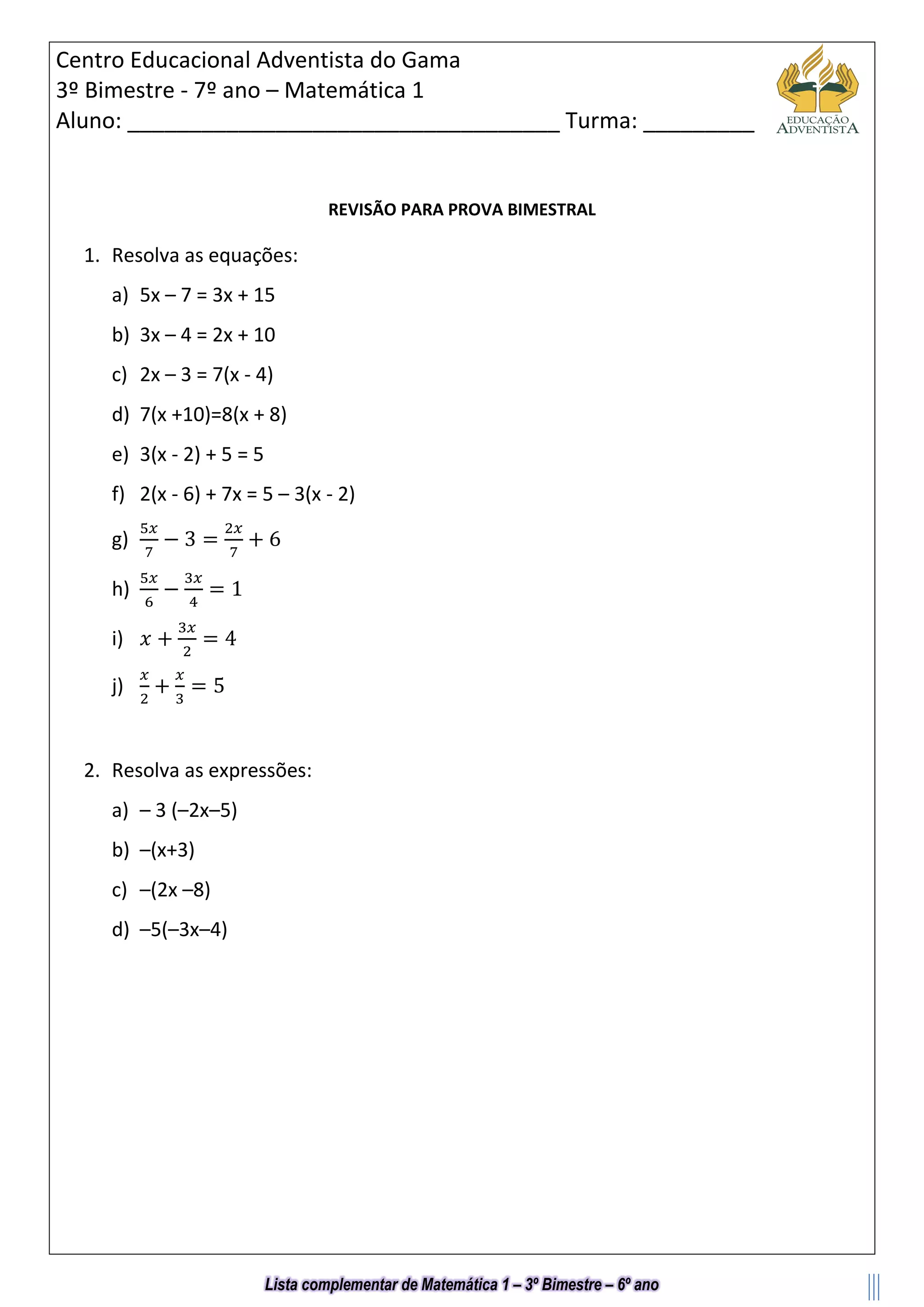 Este documento é uma revisão para prova bimestral de Matemática do 7o ano no Centro Educacional Adventista do Gama. Contém 9 questões de resolução de equações e 4 questões de resolução de expressões algébricas.