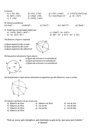 2) Os exercícios abordam diferentes tópicos como sistemas de equações, classificação de expressões algébricas, operações com monômios, redução de termos semelhantes e cálculo de perímetros de círculos com dados de diâmetros e