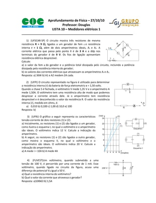 O documento apresenta 4 questões sobre circuitos elétricos e medidores. A primeira pergunta pede para calcular a tensão de um gerador e a potência total dissipada no circuito, além das correntes em dois amperímetros. A segunda pergunta pede para calcular a resistência interna de uma bateria usando dados de um voltímetro e amperímetro. A terceira pergunta pede para calcular as leituras de um amperímetro em dois circuitos. E a quarta pergunta pede para calcular a resistência interna de um voltímetro e a cor