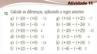 O documento apresenta 20 exercícios de matemática envolvendo números positivos e negativos, operações algébricas e resolução de problemas. Os exercícios abordam conceitos como opostos, ordenação numérica, adição e subtração algébrica e resolução de situações do mundo real envolvendo temperatura e profundidade.