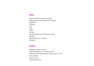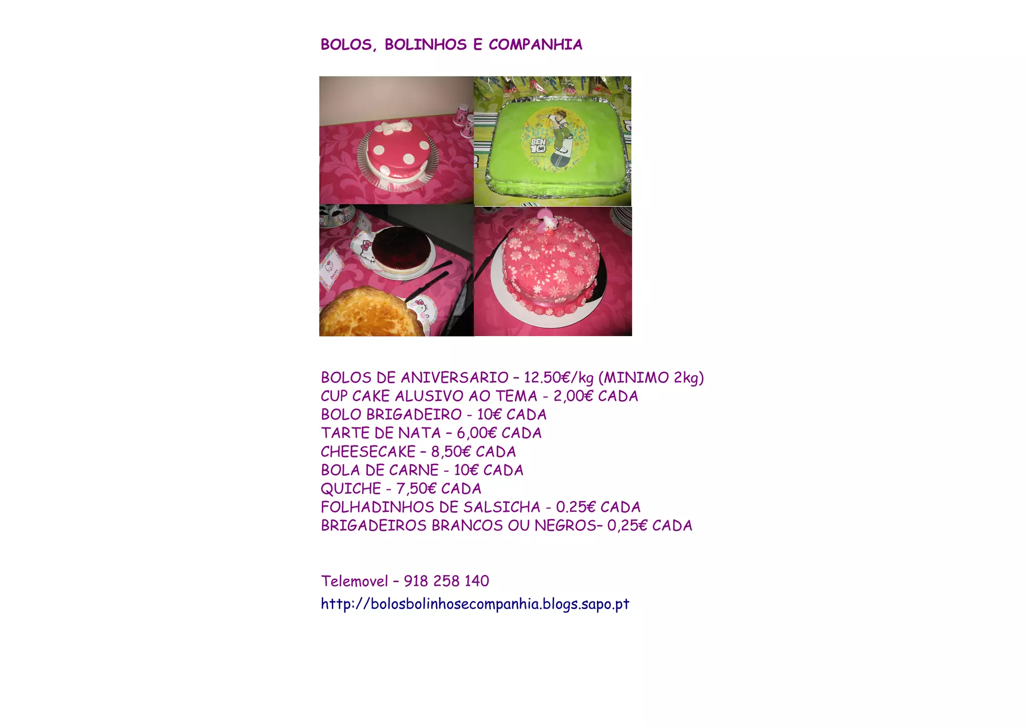 Este documento lista bolos, bolinhos e outros itens de confeitaria como cupcakes, bolos de aniversário, tarte de nata, queijadas e bolinhos de salsicha, fornecendo os preços de cada item. Também lista massas e recheios populares como brigadeiro, chantilly, ganache de chocolate e doce de leite.