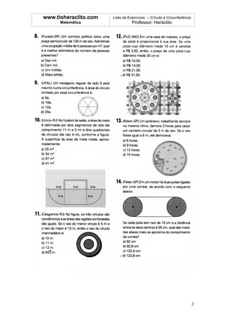 O documento é uma lista de exercícios de matemática sobre círculos e circunferências preparada pelo professor Heráclito para o site www.tioheraclito.com. A lista contém exercícios que envolvem calcular o comprimento da circunferência, área do círculo, setores circulares e ângulos no círculo.