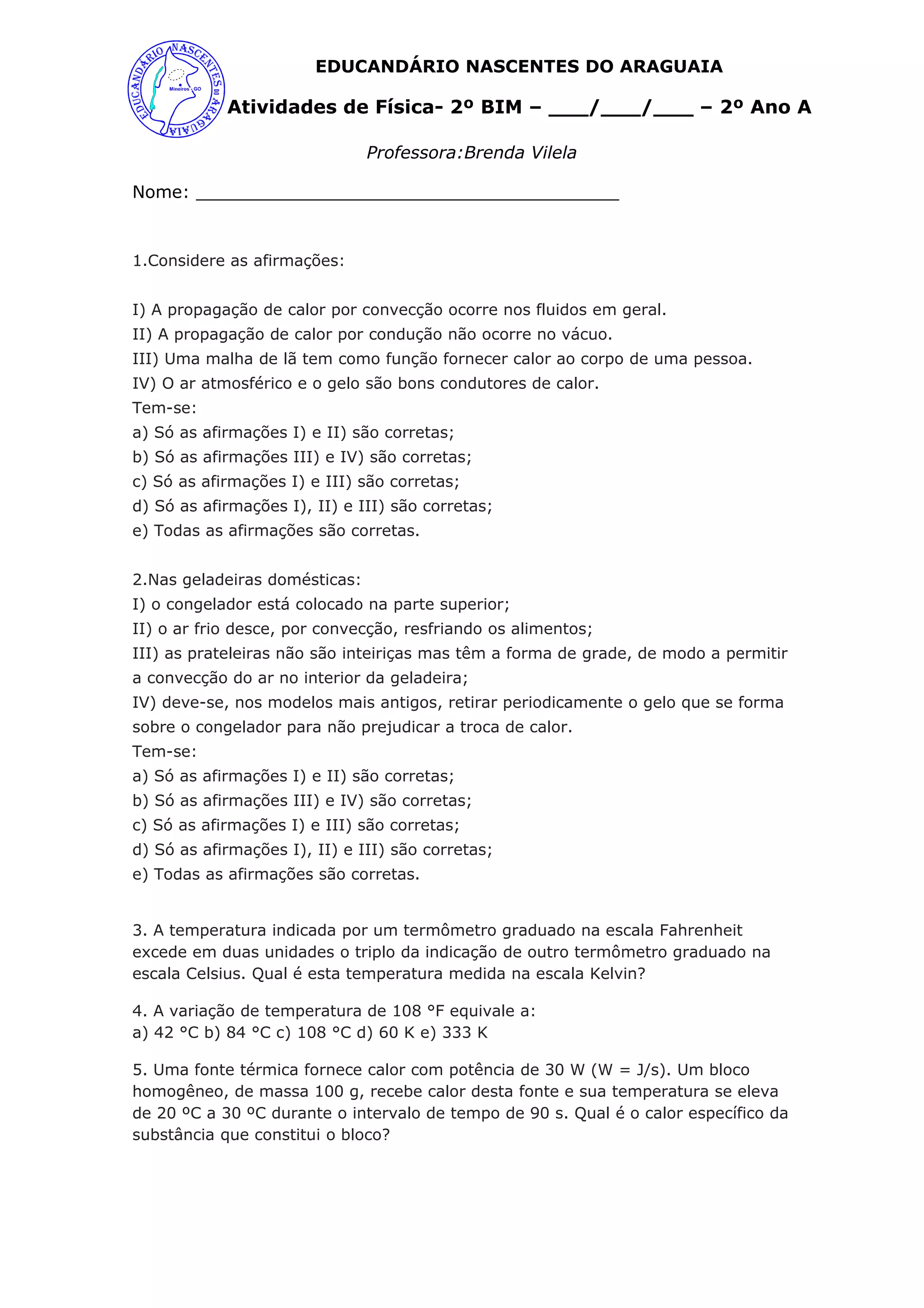 Atividades de Física- 2º BIM – ___/___/___ – 2º Ano A