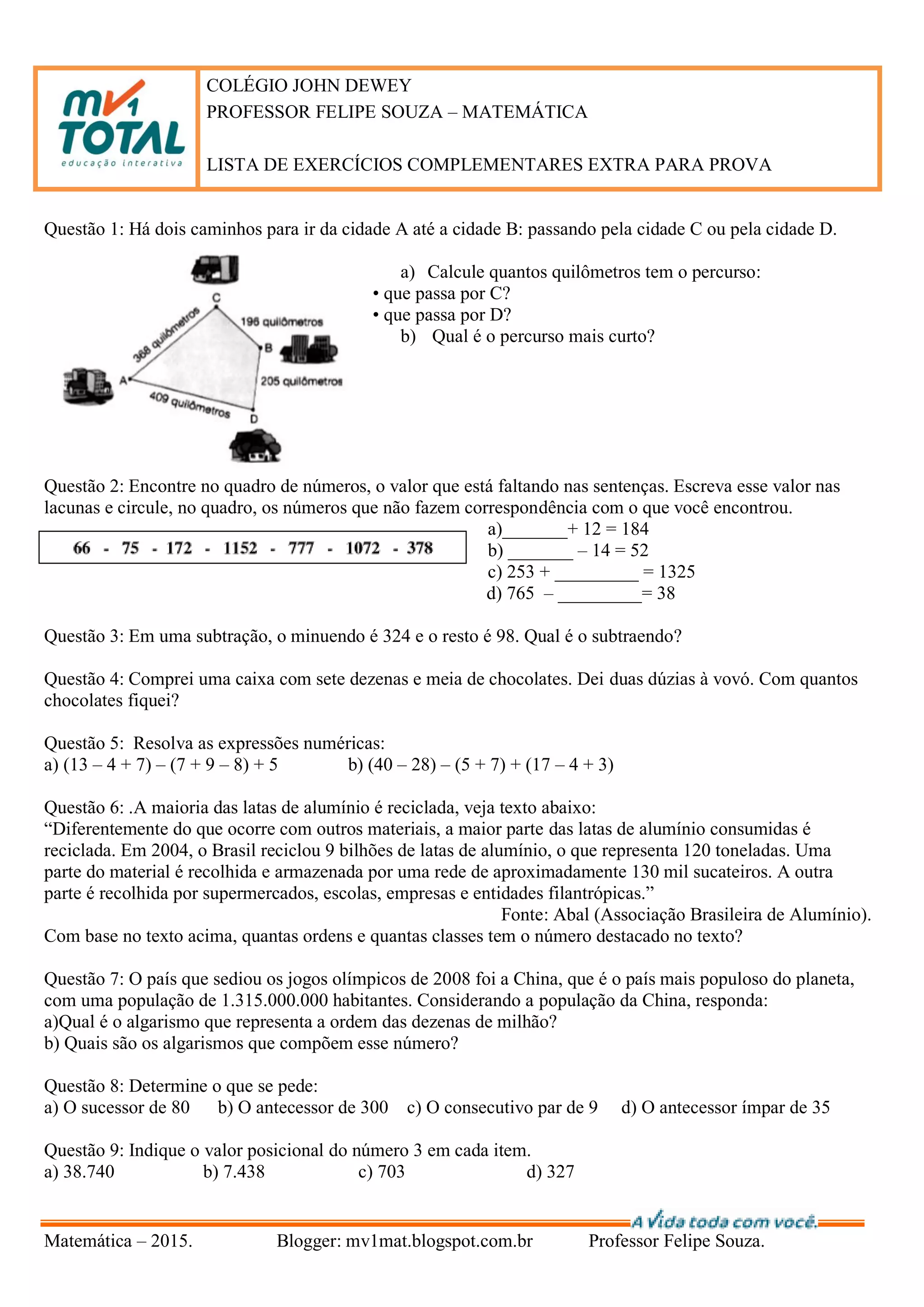 O documento contém 20 questões de matemática sobre vários tópicos como: cálculo de distâncias, operações com números, porcentagem, ordenação de números, valor posicional, conversão entre sistemas numéricos e resolução de problemas. As questões variam de cálculos simples a problemas mais complexos envolvendo várias etapas.