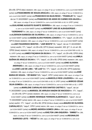 O documento lista os nomes de pessoas acusadas de diversos crimes, incluindo associação ao tráfico de drogas, auxílio ao uso indevido de drogas, estelionato, formação de quadrilha e violação de sigilo funcional. As acusações incluem o número de vezes que cada crime foi alegadamente cometido por cada pessoa.