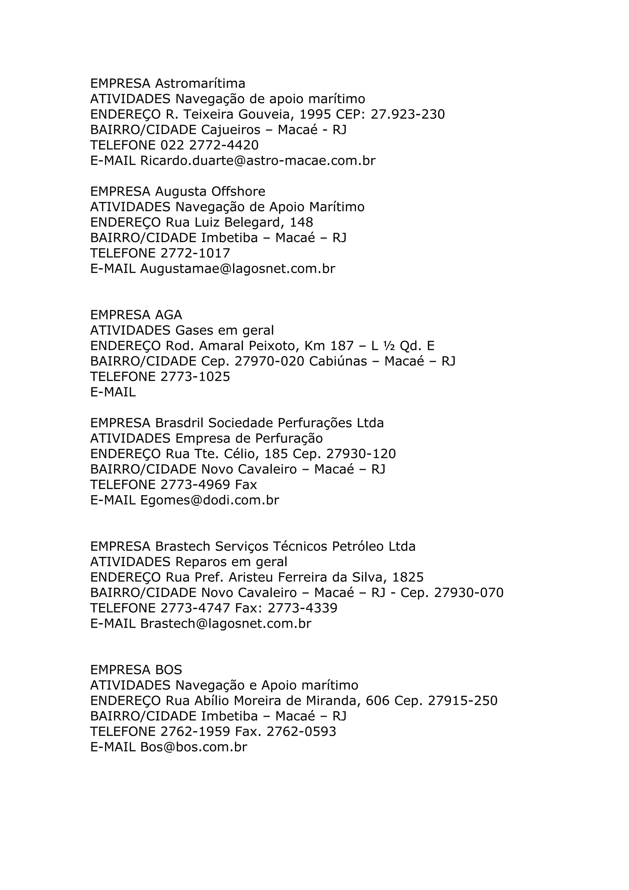 O documento lista informações de contato de várias empresas que atuam em Macaé, Rio de Janeiro, incluindo seus nomes, endereços, telefones e e-mails. Também lista informações de algumas agências de emprego no Rio de Janeiro.