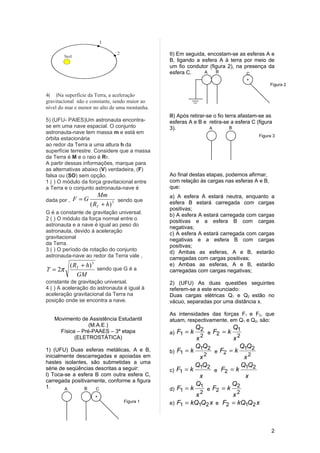 3) São solicitadas respostas sobre assuntos como órbitas planetárias, forças elétricas e equilíbrio de cargas submetidas a campos elétricos.
