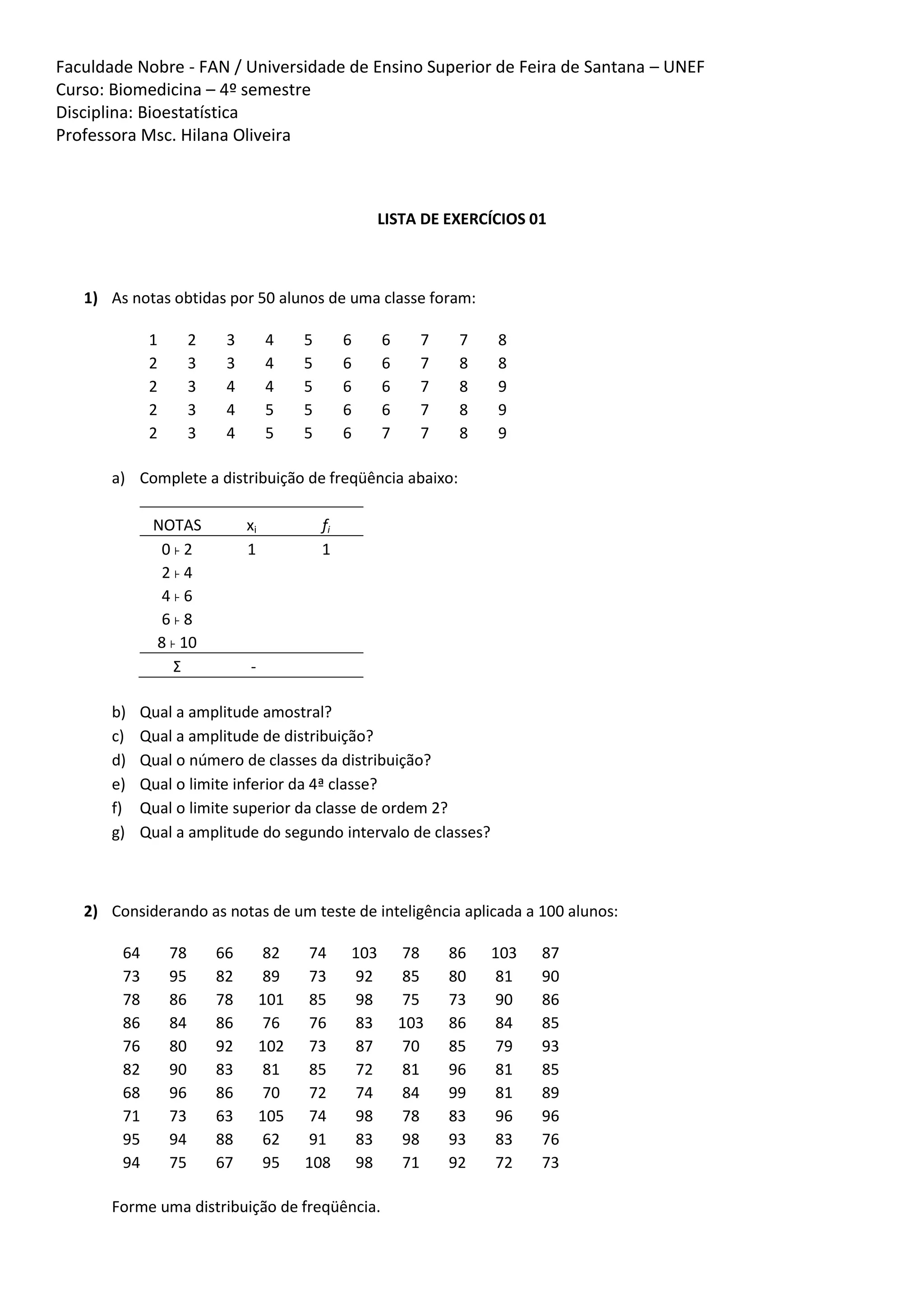2. O primeiro exercício pede para completar uma distribuição de frequência com notas de alunos e responder perguntas sobre a distribuição.