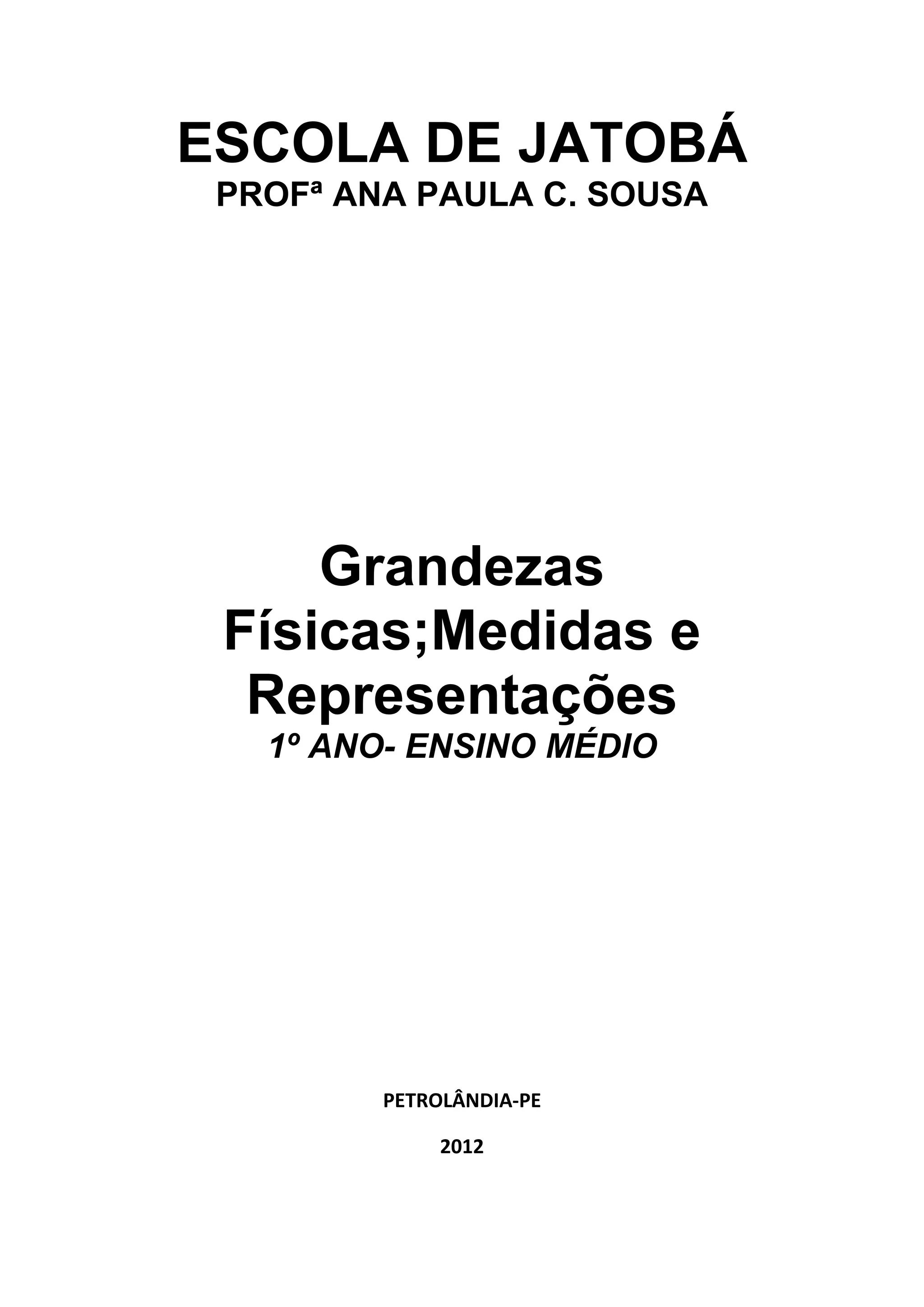 Este documento é um plano de aula para o 1o ano do ensino médio da Escola de Jatobá em Petrolândia-PE e trata do tema Grandezas Físicas, Medidas e Representações. O plano de aula foi elaborado pela professora Ana Paula C. Sousa para o ano de 2012.
