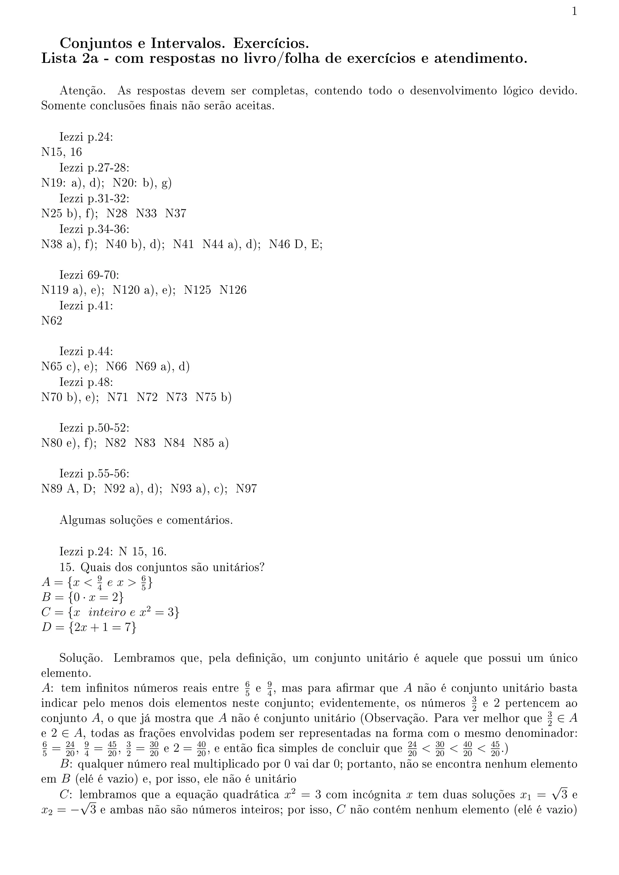 Este documento fornece uma lista de exercícios sobre conjuntos e intervalos retirados do livro de Iezzi, com as páginas e questões indicadas. Há também algumas soluções e comentários para algumas questões.