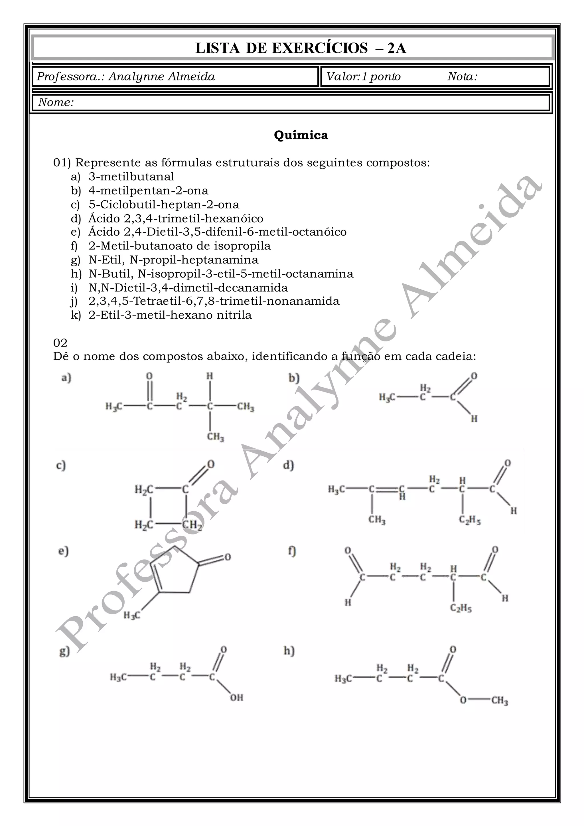 A lista de exercícios pede para (1) representar as fórmulas estruturais de vários compostos orgânicos e (2) nomear compostos identificando suas funções. Os exercícios incluem aldeídos, cetonas, ácidos carboxílicos, ésteres, aminas e nitrilas.
