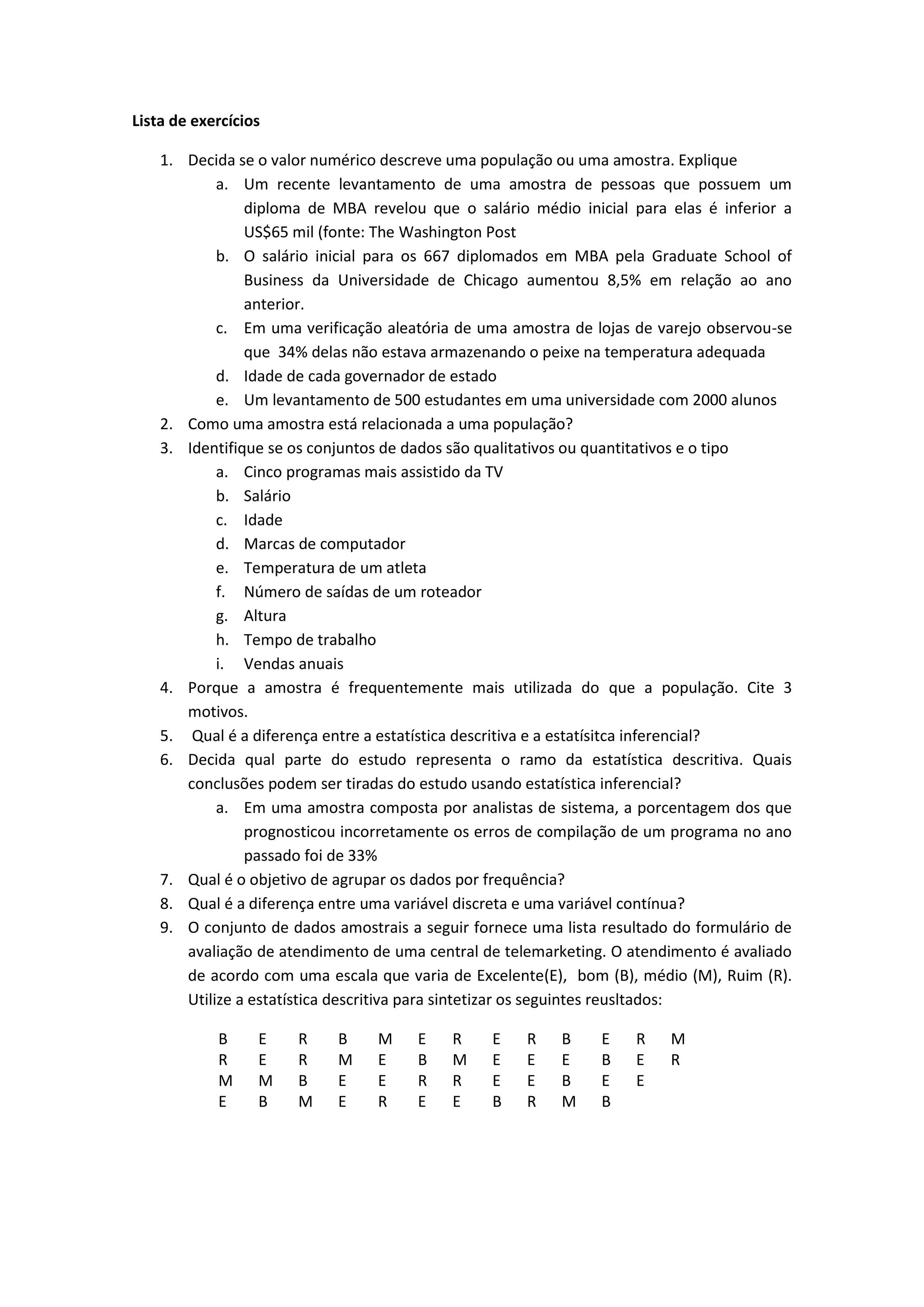 1. O documento apresenta uma lista de 22 exercícios sobre estatística descritiva e inferencial. Os exercícios abordam temas como amostra vs população, tipos de variáveis, medidas de tendência central, medidas de dispersão e construção de distribuições de frequências.