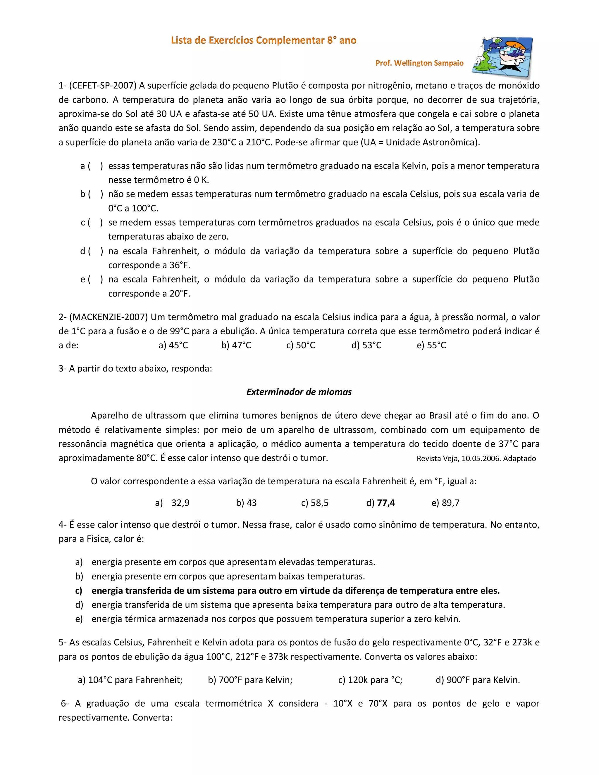 3. O aumento de temperatura de 37°C a 80°C usado para destruir miomas corresponde a uma variação de temperatura de 143