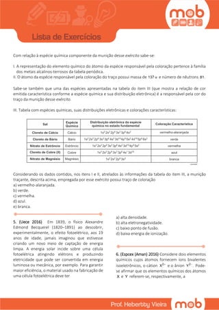 2) O documento apresenta uma série de questões sobre conceitos atômicos e propriedades de elementos químicos.