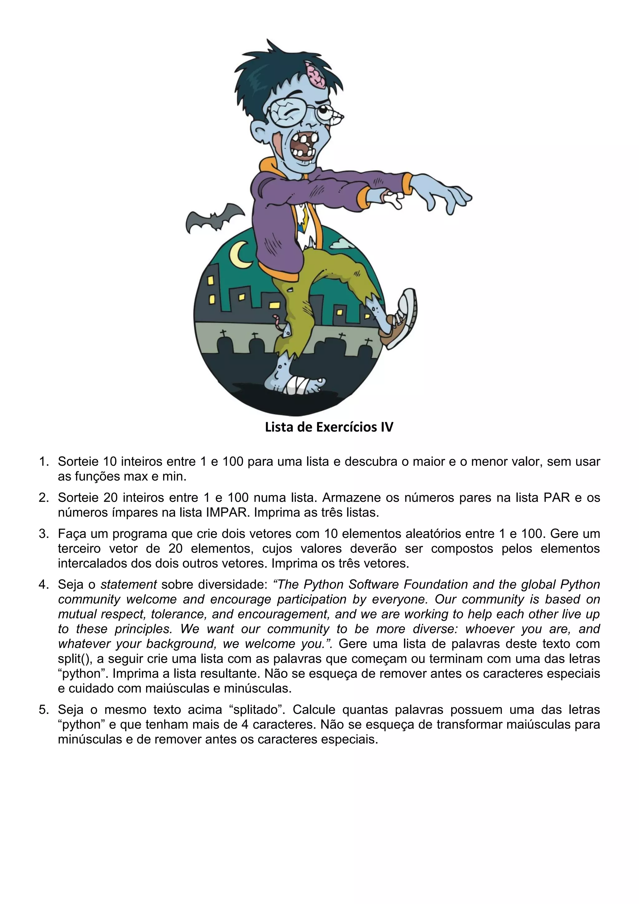 O documento apresenta 5 exercícios sobre listas e manipulação de dados em Python. O primeiro exercício pede para encontrar o maior e menor valor de uma lista de números aleatórios sem usar as funções max e min. O segundo exercício pede para separar números pares e ímpares em listas distintas. O terceiro exercício pede para intercalar elementos de duas listas em uma terceira lista. O quarto exercício pede para filtrar palavras de um texto que contenham letras de "python". E o quinto exercício pede para contar palavras de um texto