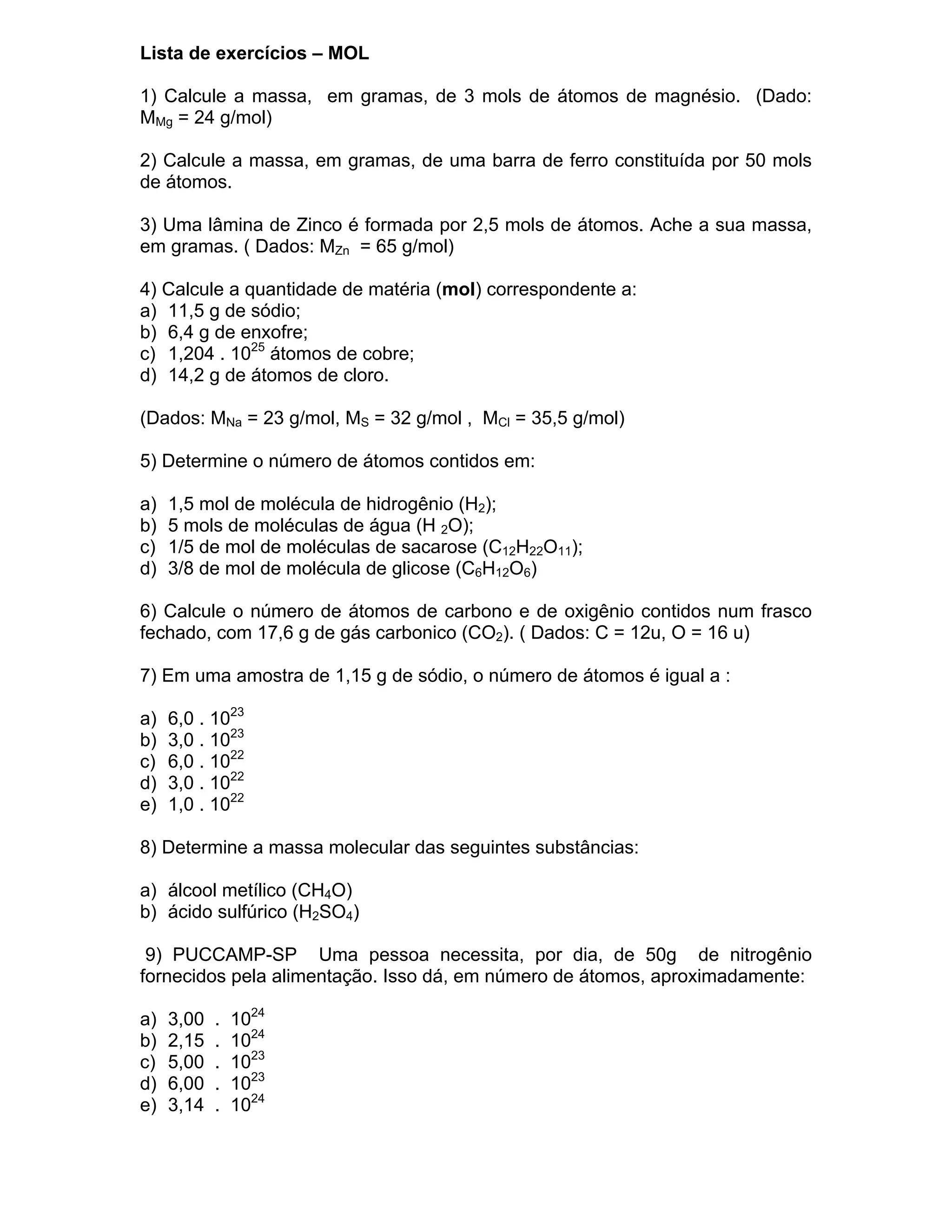 1) O documento apresenta uma lista de exercícios sobre cálculos envolvendo massa molecular, quantidade de matéria, número de átomos e moléculas em diferentes substâncias químicas.