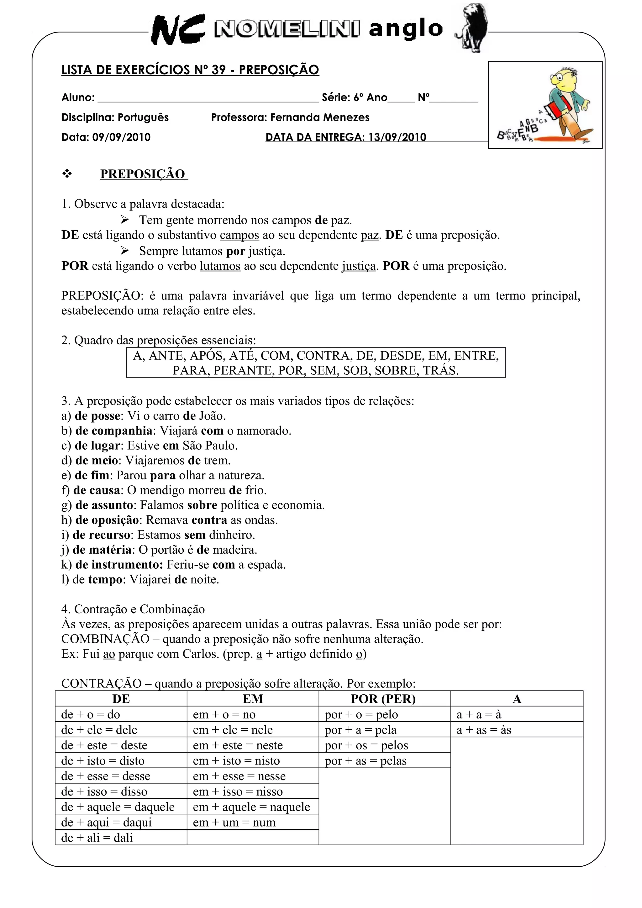 Este documento é uma lista de exercícios sobre preposições para alunos do 6o ano. Ele fornece exemplos de uso de preposições, define o que são preposições, lista preposições essenciais e relações que podem estabelecer. O documento termina com vários exercícios para identificar e usar corretamente preposições em frases.