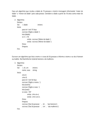 O documento contém 12 algoritmos que realizam operações como cálculo de fatorial, contagem de números dentro de um intervalo, classificação de idade como maior ou menor de idade, contagem de homens e mulheres, análise de lucro ou prejuízo em vendas, impressão de números em ordem crescente e decrescente, cálculo de tabuadas.
