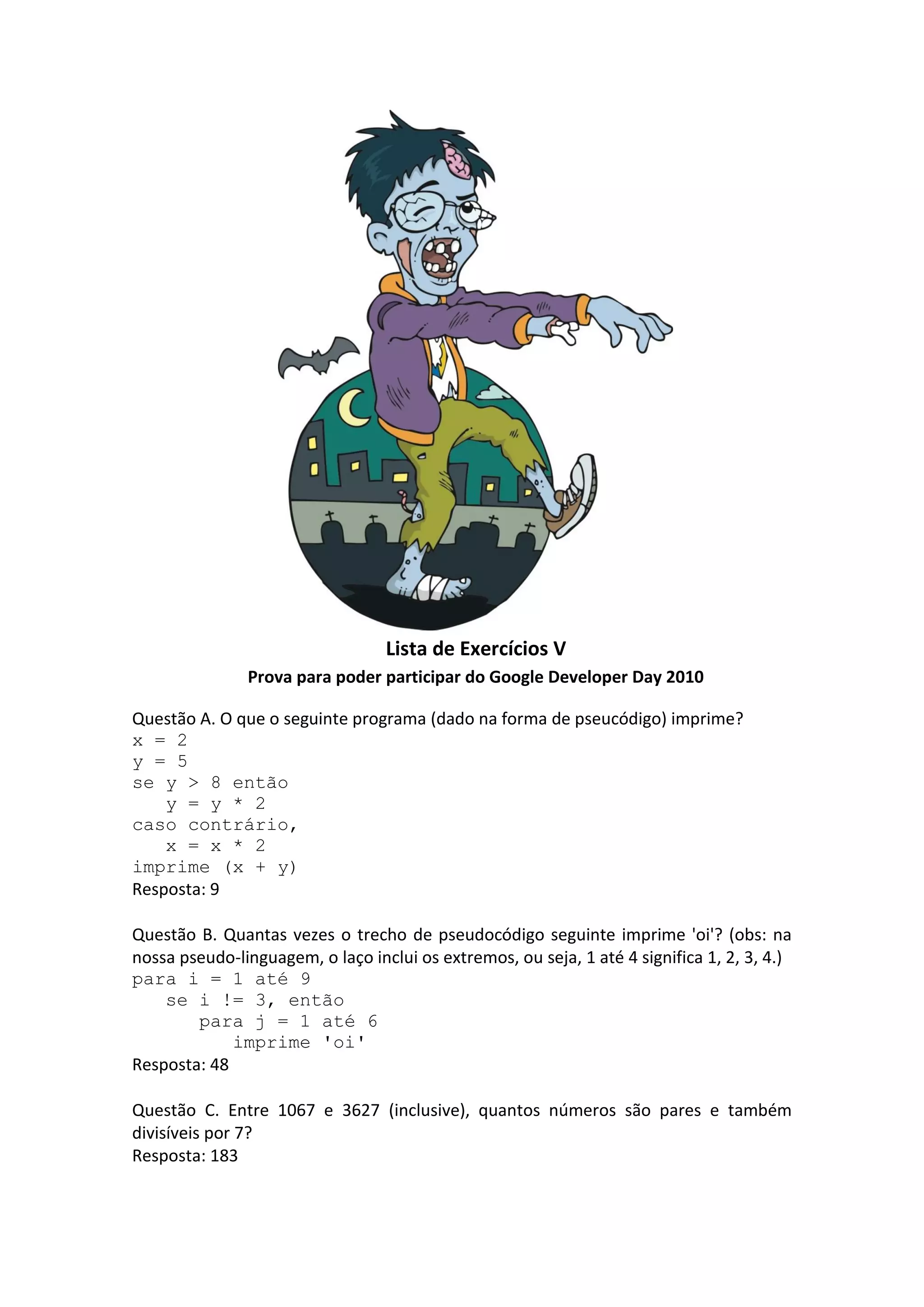 Este documento contém 5 questões sobre programação e matemática, incluindo um problema sobre números sortudos e telefones válidos de acordo com certas regras. O documento fornece resumos concisos de problemas de programação, matemática e lógica.