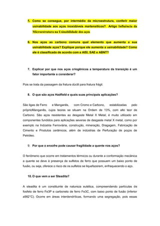 O documento discute vários tópicos sobre classificação e propriedades de aços e ferros fundidos. A pergunta 1 explica que as letras ou números nos códigos de classificação de aços indicam o teor de carbono. A pergunta 2 descreve como os aços são classificados de acordo com a microestrutura, composição química e aplicação. A pergunta 14 explica que o ferro fundido cinzento tem baixa resistência e é frágil quando comparado ao aço.
