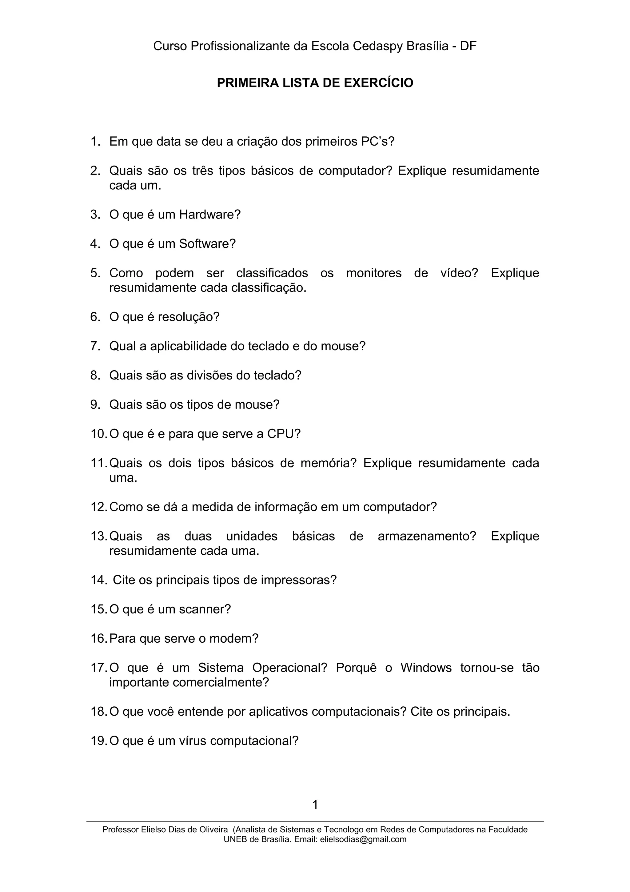 O documento apresenta 19 perguntas sobre conceitos básicos de informática, incluindo a data de criação dos primeiros PCs, os tipos de computadores, hardware, software, monitores, teclado, mouse, CPU, memória, armazenamento, impressoras, scanners, modems, sistemas operacionais, aplicativos e vírus. As perguntas abordam definições e aplicações destes termos e conceitos fundamentais de informática.