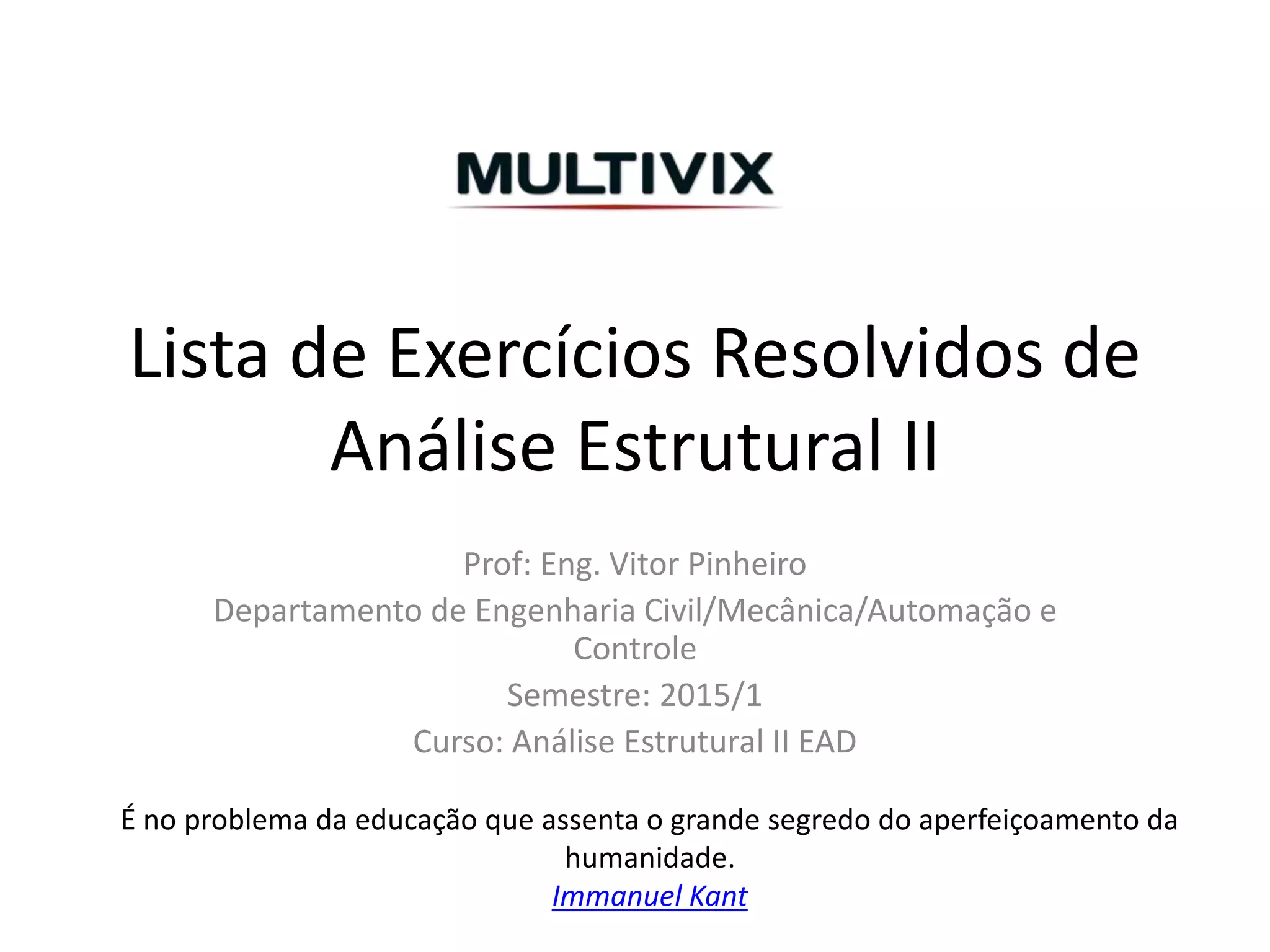 Este documento apresenta uma lista de 10 exercícios resolvidos de Análise Estrutural II, incluindo o cálculo de carregamentos internos, forças em membros de treliças, funções de cortante e momento em vigas, energia potencial elástica e equações de curva elástica de vigas. As soluções utilizam métodos como o Princípio dos Trabalhos Virtuais e Teorema de Castigliano.