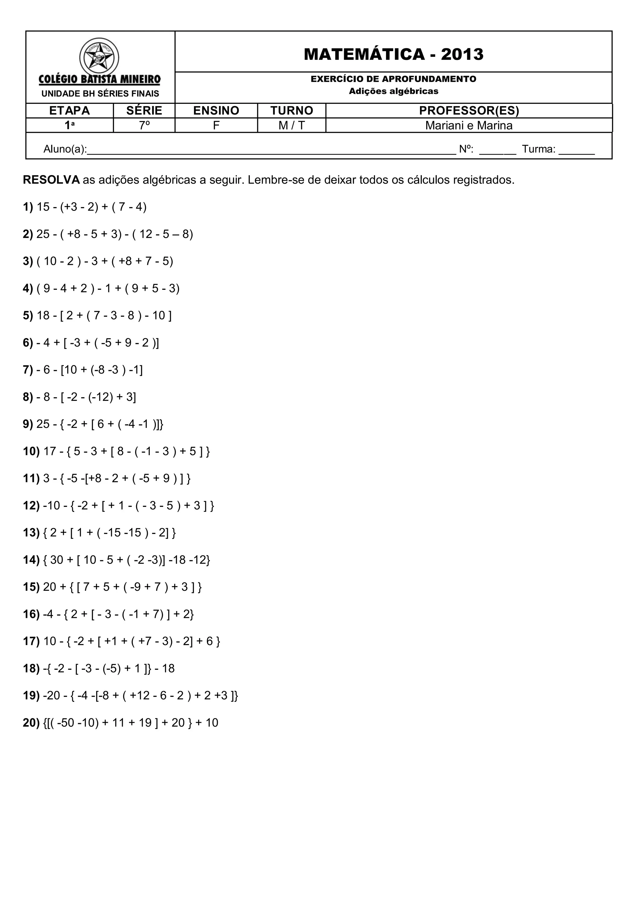 2) O aluno deve resolver as adições algébricas deixando todos os cálculos registrados.