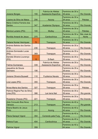O documento lista os participantes de uma competição esportiva divididos por nome, número, equipe, categoria, gênero e cidade. Há participantes de várias idades, equipes e cidades do Rio Grande do Sul.