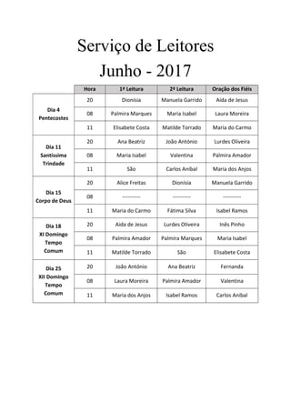 Este documento lista o serviço de leitores para vários dias de junho, incluindo os nomes das pessoas que lerão a primeira e segunda leitura e conduzirão a oração dos fiéis para cada missa.