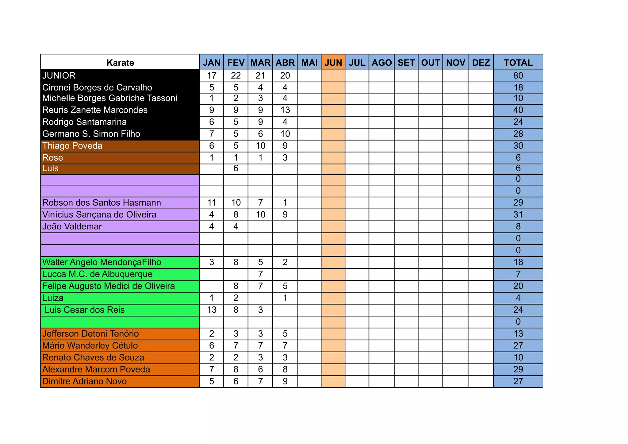 O documento fornece estatísticas de participação em aulas de karatê por aluno em cada mês do ano, com o total anual. No geral, houve 80 aulas no ano com participação total de 176 treinos entre todos os alunos.