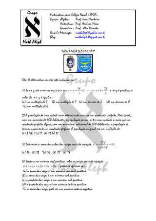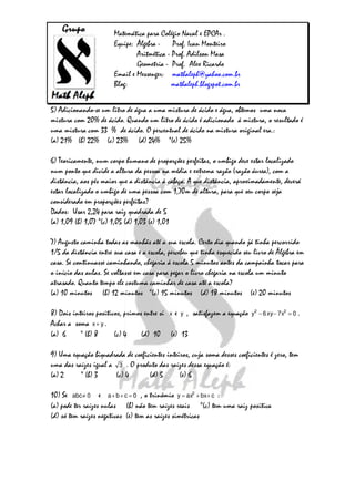 Este documento fornece informações sobre um grupo de professores de matemática e seus contatos, além de propor 10 questões de matemática com alternativas de resposta.