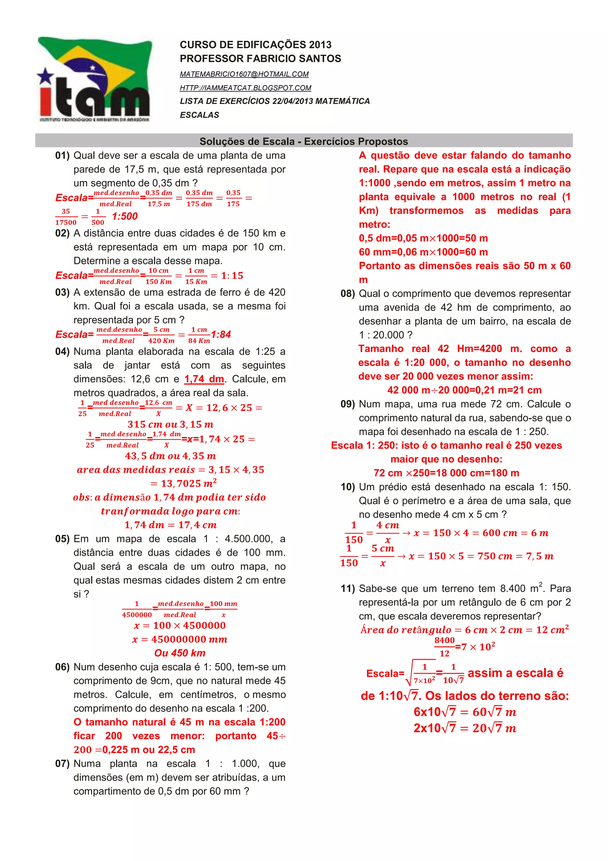 O documento apresenta 16 exercícios sobre escalas em plantas, mapas e desenhos técnicos. Os exercícios abordam cálculos para determinar escalas, conversão de medidas entre a representação gráfica e a realidade e determinação de áreas e distâncias usando diferentes escalas.