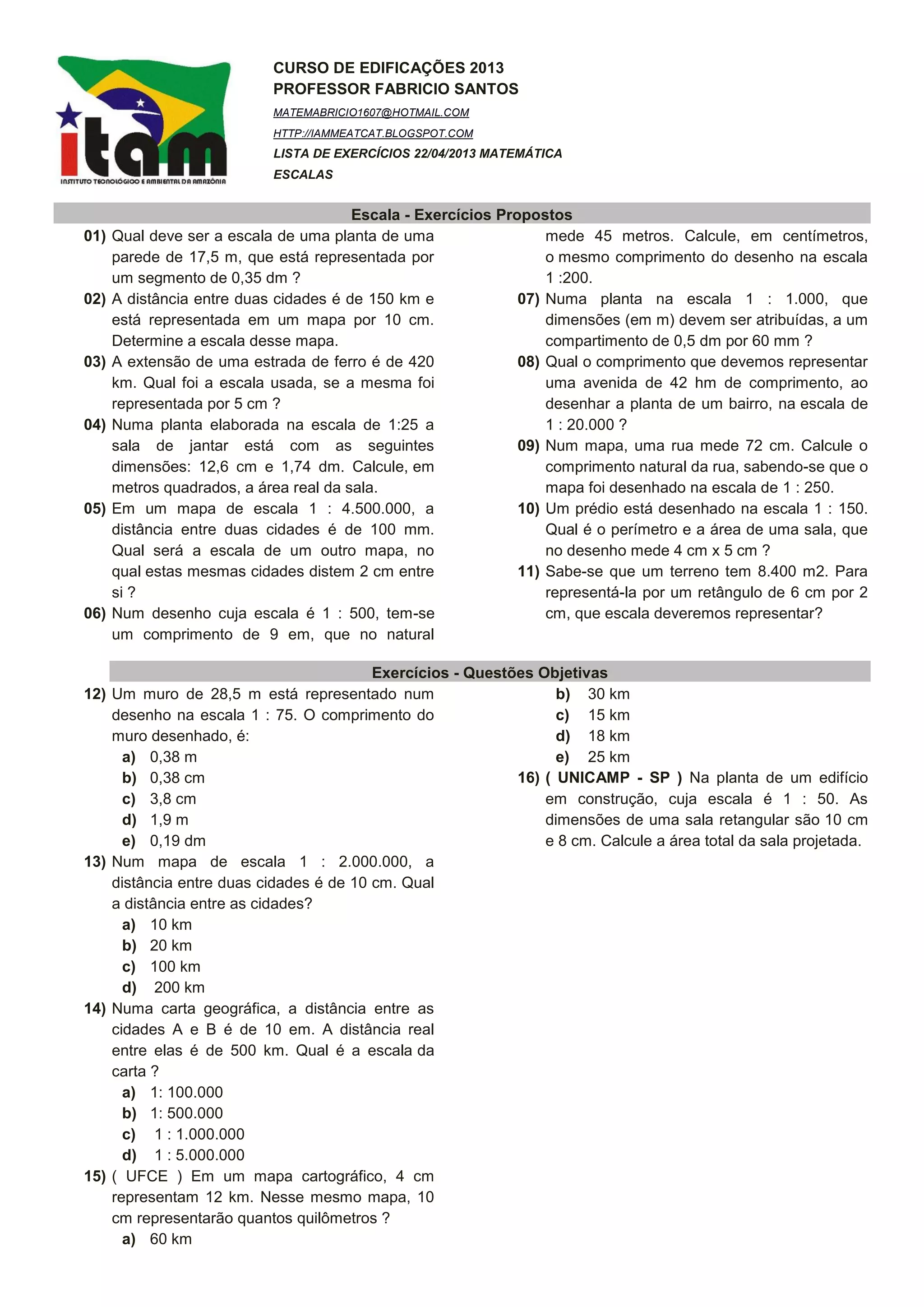 Este documento é uma lista de exercícios de matemática sobre escalas. Contém 16 exercícios sobre como calcular escalas em plantas, mapas e desenhos técnicos, bem como como determinar medidas reais a partir de medidas representadas em escala. Também fornece o contato de um professor de edificações que elaborou a lista de exercícios.