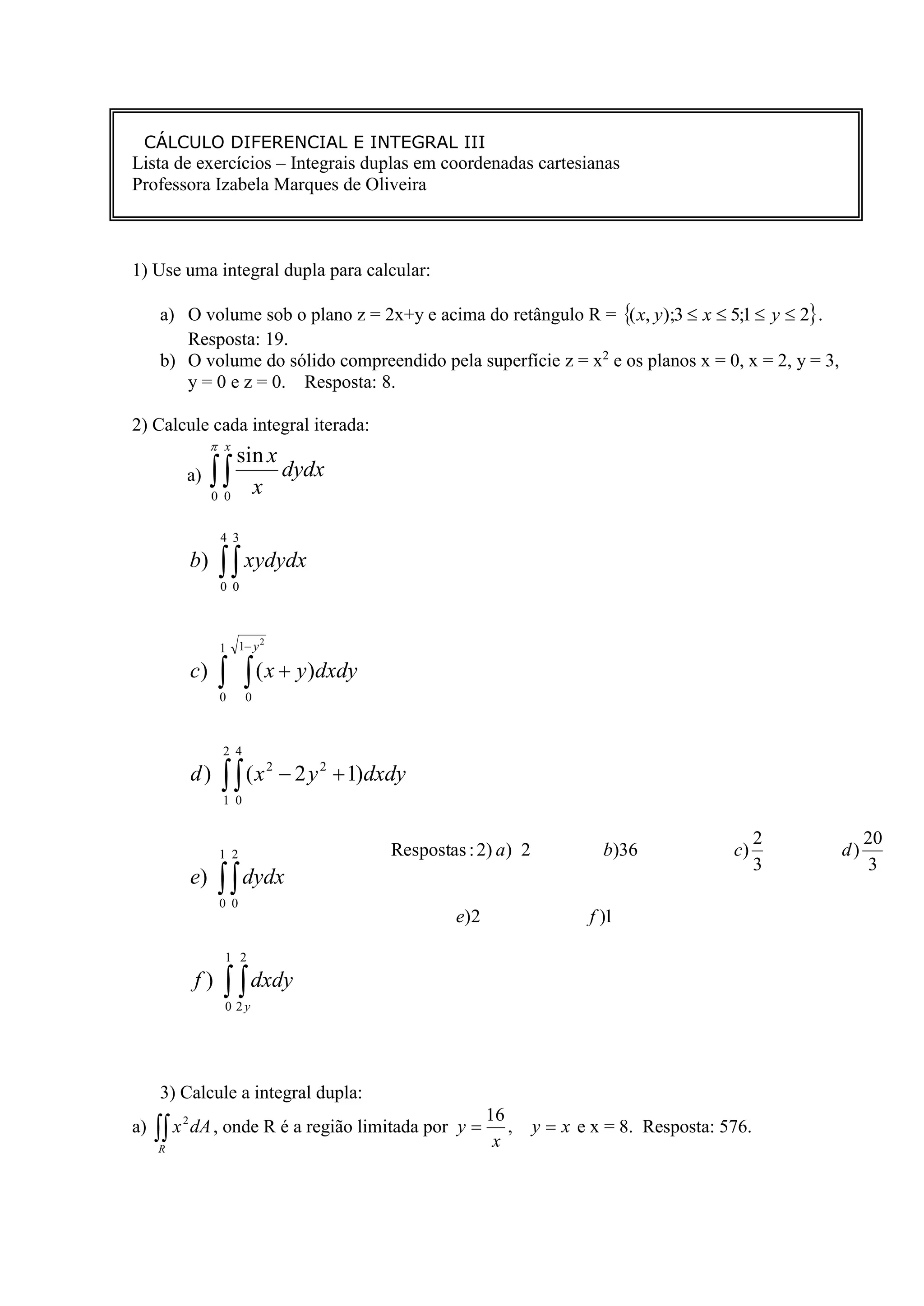 O documento apresenta uma lista de exercícios sobre integrais duplas em coordenadas cartesianas. Os exercícios incluem o cálculo de volumes sob superfícies e planos usando integrais duplas, cálculo de integrais iteradas, determinação de áreas de regiões delimitadas por curvas e retas, e cálculo do centro de massa de uma placa triangular com densidade variável.