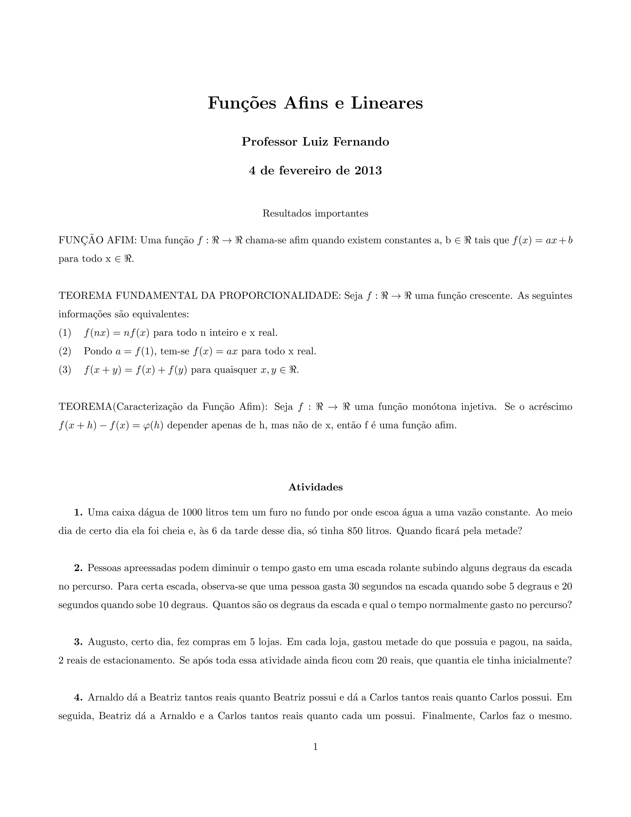 1) O documento discute funções afins e lineares, incluindo sua definição e teoremas fundamentais sobre proporcionalidade e caracterização de funções afins.